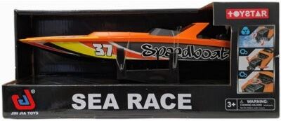 Motorówka wyścigowa w kolorze pomarańczowym, idealna do zabawy w wodzie.