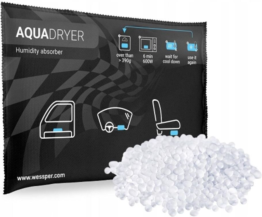 Wielorazowy pochłaniacz wilgoci AQUADRYER Wessper - Czarny Pochłaniacz Wilgoci marki Wessper skutecznie i szybko usuwa nadmiar wilgoci z wnętrza samochodu, małych pomieszczeń gospodarczych oraz zawilgoconych przedmiotów. Specjalne kulki umieszczone w środku pochłaniacza skutecznie wchłaniają wilgoć …