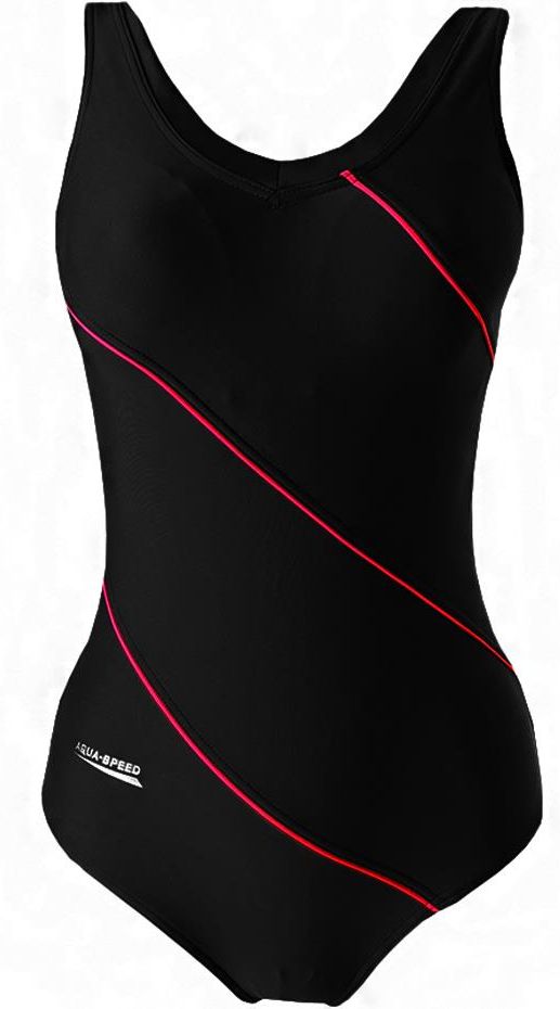 AQUASPEED STRÓJ KĄPIELOWY SOPHIE 54 CZARNY/CZERWONY 16 441 Kostium kąpielowy damski Aqua Speed to doskonały wybór dla każdej kobiety chcącej czuć się atrakcyjnie nad jeziorem, morzem lub na basenie. Tylny panel zakrywający plecy, ale odsłaniający łopatki zapewnia naturalny ruch ramion ramion, a kontrastowy wzór w przedniej części optycznie wysmukli sylwetkę. Kostium kąpielowy damski posiada średni krój nogawek, wszyte miseczki, co znacząco podnosi komfort noszenia. Nie pilingujący się materiał Malaga zapewnia optymalny balans pomiędzy elastycznością a lekkością. Co więcej filtr UPF 50+ zapewnia zwiększoną odporność na promieniowanie słoneczne. Dodatkową zaletą dzianiny wykonanej z użyciem LYCRA® XTRA LIFE™ jest wysoka odporność na działanie chloru i uszkodzenia mechaniczne, dlatego nie musisz się martwić o szybkie wyblaknięcie koloru. Wszystkie atuty potwierdzają, że stój kąpielowy damski sprawdzi się zarówno do pływania rekreacyjnego, aqua aerobiku, jak i treningów pływackich. Materiał Malaga 80%poliamid, 20% elastan