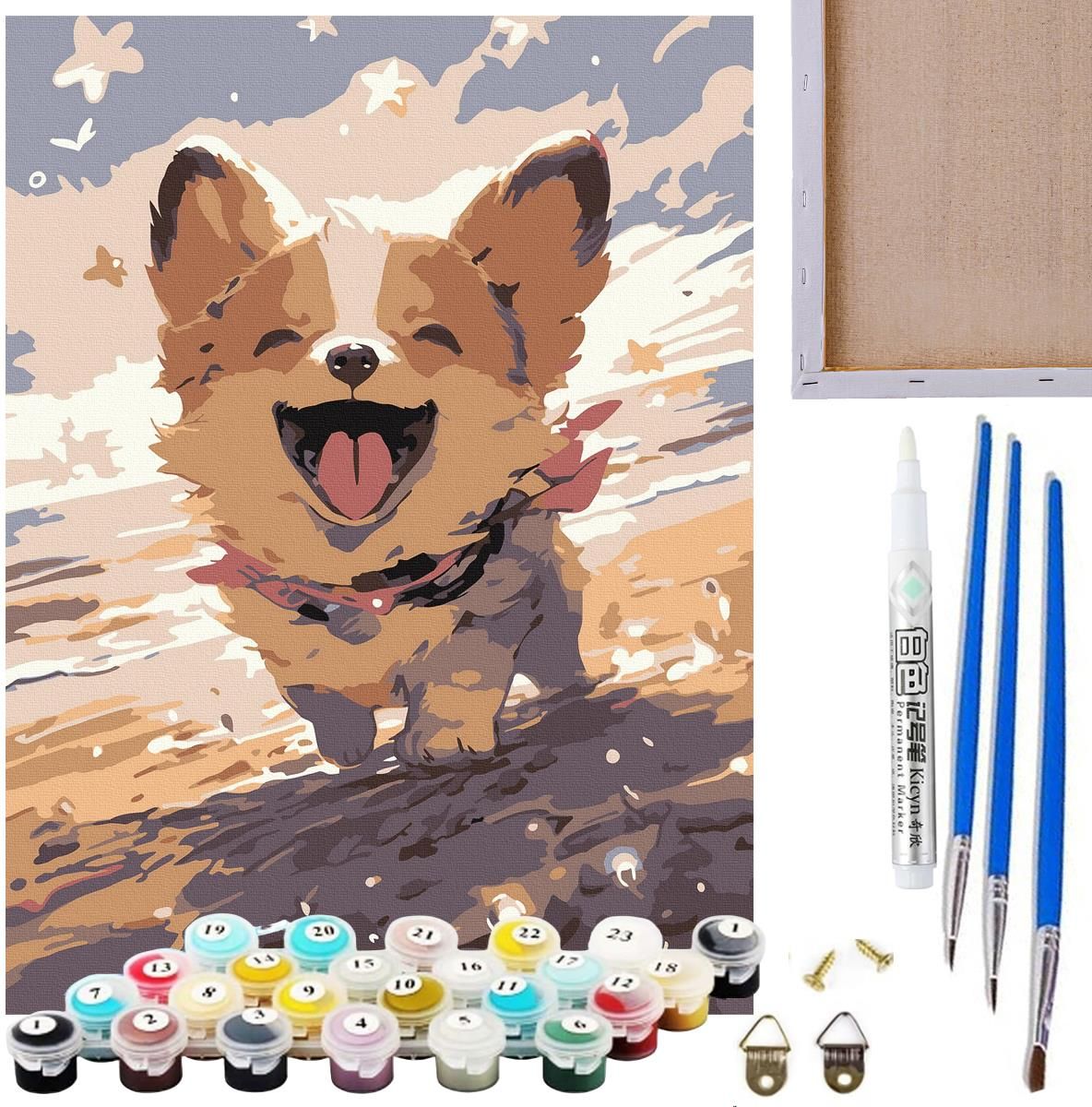 Zestaw Maluj po numerach Artnico 40x50 Corgi 3 x pędzle 17 x farbki 2 x haczyki do zawieszenia 2 x śrubki Wzornik Biały marker Oryginalne opakowanie z uchwytem