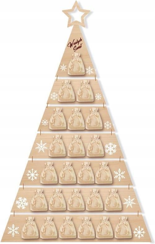 Deku - Kalendarz adwentowy Choinka Duża 24 Woreczki lniane na drobiazgi 130x70 cm Uwielbiasz Świąteczny nastrój w swoim domu? Odliczaj czas do świątecznych dni przy pomocy przepięknego kalendarza stworzonego z lnianych woreczków powieszonych na ogromnej, drewnianej choince. Schowaj najróżniejsze drobiazgi w każdym z 24 woreczków. Odliczanie dni, za pomocą kalendarza adwentowego, to w wielu domach tradycyjna część grudniowego oczekiwania na Wigilię. Kalendarz adwentowy, w formie świątecznej, wiszącej choinki. Spraw aby Twój kalendarz adwentowy był wyjątkowy. Świetnie sprawdzi się jako ozdoba Świąteczna w Twoim domu, podczas oczekiwania na Święta! Włóż do woreczków słodkości lub upominki i gotowe! Stylowa dekoracja w formie wiszącej choinki z woreczkami na drobiazgi do zawieszania. Przeznaczona zarówno do dekoracji wnętrz, do tradycyjnego odliczania dni do Wigilii, oraz do przechowywania ulubionych, świątecznych drobiazgów. Nadaje Świąteczny klimat Posiada 24 dołączone woreczki na drobiazgi z ozdobą na sznureczku Oryginalny kalendarz adwentowy z drobiazgami na każdy dzień Design: Piękna ozdoba wisząca na ścianę. Umili oczekiwanie na cudowny czas Świąt Bożego Narodzenia i zapewni codzienną radość z odkrywania prezentów. Całość zapakowana jest w jeden duży lniany worek na prezenty! Specyfikacja: wymiary woreczka - szerokość: 17 cm / wysokość: 21 cm grubość ozdobnych elementów 3 mm materiał: sklejka brzozowa sznurek jutowy: 5m kolor: naturalne niemalowane drewno 24 lniane woreczki na drobiazgi Z grawerunkiem W zestawie: 24x - lniane woreczki 24x - ozdoby z grawerunkiem: 8x choinka, 8x gwiazdka, 8x dzwoneczek 24x - spinacze sznurek jutowy - 5m sznurek czerwony - 24 kawałki Kalendarze zawsze są starannie zapakowane i zabezpieczone, by nie uległy zniszczeniu podczas transportu.