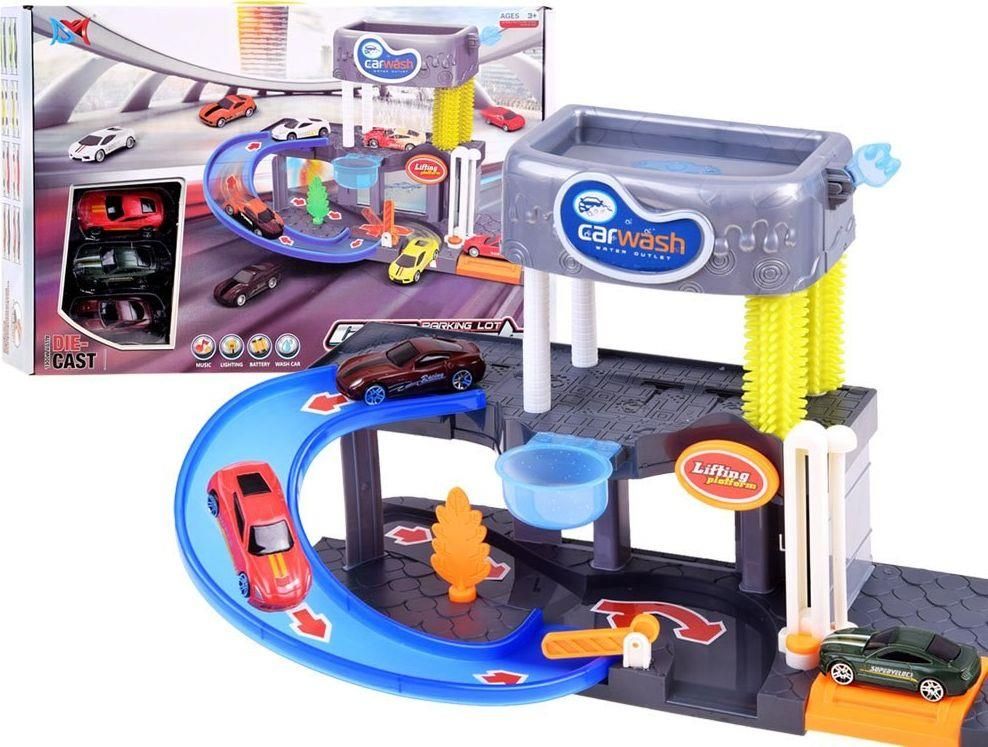 Dwu poziomowa myjnia samochodowa do dbania o pojazdy to propozycja dla koneserów czystych pojazdów. Myjnia z podjazdem, windą, prawdziwą wodą lecącą, silikonowymi szczotkami, efektami dźwiękowymi i świetlnymi zachwyci każde dziecko. Cały zestaw wykonany jest z plastiku, na parterze znajduje się winda, dzięki której można samochód wywieźć do góry, następnie po umyciu pojazdu auto zjedzie bezpiecznie w dół. Aby umyć pojazd należy w górnej części zabawki umieścić odrobinę wody, następnie za pomocą niebieskiej łapki dozować wodę spadającą na autko. Po zmyciu kurzu z samochodu pojazd zjeżdża w dół gdzie zostaje osuszony za pomocą ręcznika. Całości opatrzona jest w naklejki, efekty świetlne i dźwiękowe uatrakcyjnią zabawę. Zestaw zawiera - elementy do zbudowania myjni - 3 samochody z metalową karoserią - ręcznik/szmatka do osuszania pojazdu - zestaw naklejek Wymiary: - myjnia 37 x 15 x 25 cm - autko 8 cm Bogato wyposażony zestaw sprawdzi się podczas niejednej zabawy. Całość jest przeznaczona do samodzielnego złożenia. Dzięki takiemu zestawowi dziecko może wymyślać mnóstwo wesołej zabawy samodzielnie lub z kolegami. W sklepie Jokomisiada jest bardzo szeroki wybór zabawek jeżdżących, latających, samochodów, helikopterów.. Zabawka garaż zapakowana jest w efektowne opakowanie, które świetnie sprawdzi się jako prezent.