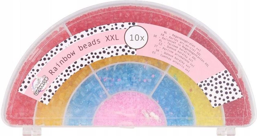 DUZY ZESTAW KORALIKÓW Różne rodzaje koralików w wesołym pudełeczku Do wyboru różne motywy kolorystyczne Zestaw zawiera żyłkę i 2 komplety zapięć. Pudełko z 10 przegrodami. Z dobrze wyposażonym pudełkiem z koralikami można zrobić wiele bransoletek. Co zrobisz z kolorowych koralików? Stwórz własną biżuterię albo udekoruj nimi np. kartki.