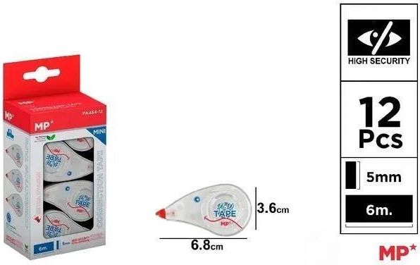Sucha taśma korekcyjna Do-Do. Ekstra nieprzezroczysty,wysoki poziom bezpieczeństwa dla poufnych poprawek. Umożliwia błyskawiczne pisanie po nim. Korekta z przodu. Nietoksyczny. Płynnie przesuwa się po papierze bez zacięć. Szerokośćtaśmy: 5 mm. Długość: 6m. Pudełko 12 sztukz białym korpusem. 1 szt. = 12 korektorów.