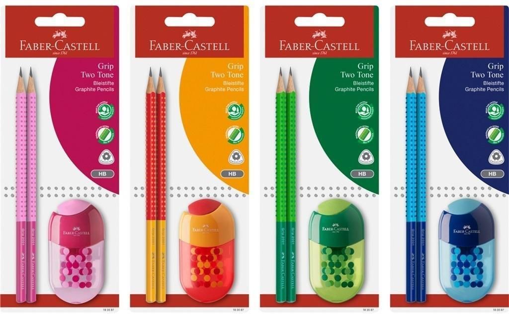 Zestaw Ołówków Grip 2001 Two Tone Faber-Castell Odkryj niezwykły zestaw ołówków grafitowych Grip 2001 Two Tone od Faber-Castell, zawierający dwie sztuki w różnorodnych kombinacjach kolorystycznych, takich jak: jasnozielono-zielony, pomarańczowo-czerwony, jasnoniebiesko-niebieski oraz jasnoróżowo-różowy. Zestaw ten wzbogacony jest o praktyczną temperówkę z dołączoną gumką, zapakowane w poręczne opakowanie blistrowe. Nawet w erze zaawansowanej technologii, gdzie biją na popularności komputery i smartfony, tradycyjny ołówek pozostaje nieodzownym narzędziem dnia codziennego. Funkcjonalność i Ergonomia Produkt charakteryzuje się ergonomicznym, trójkątnym kształtem, a opatentowana strefa Grip z drobnymi, antypoślizgowymi punktami zapewnia maksymalną wygodę podczas pisania i szkicowania, co sprzyja bez wysiłkowemu użytkowaniu. Ołówki są także dostosowane dla osób leworęcznych, dzięki ich przemyślanej konstrukcji. Wytrzymałość i Ekologia Grafit o twardości HB cechuje się dużą odpornością na pęknięcia, będąc wynikiem specjalnego, bezpiecznego procesu wiązania (SV). Produkcja opiera się na wykorzystaniu certyfikowanego drewna ze zrównoważonych źródeł, co stanowi świadectwo ekologicznych standardów firmy. Powierzchnia ołówków pokryta jest ekologiczny lakierem wodnym, przyjaznym dla środowiska oraz bezpiecznym dla dzieci. Dodatkowo używane gumki są wolne od PVC. Dostępność w różnych kolorach i zestawach jest wysyłana losowo EAN: 4005401835875