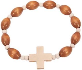 Różaniec wykonany z drewna, na gumce, można nosić jako bransoletkę.