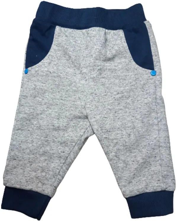 Dresowe spodenki dla maluszka wykonane z bawełny z domieszką poliestru. Szare z granatowymi wstawkami imitującymi kieszonki. Granatowy ściągacz w pasie gwarantuje idealne dopasowanie, nie uciskając przy tym brzuszka dziecka. Spodenki zakończone są ściągaczami na nogawkach, które chronią przed podwiewaniem. Z tyłu, na pupce, umieszczono dwie małe, granatowe kieszonki. Rozmiar: 74 cm Obwód w pasie: 48 cm Skład: 88% bawełna 12% poliester