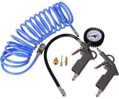 Zestaw akcesoriów pneumatycznych NAC NAIR-6-S (6 elementów). W zestawie: Pistolet do przedmuchiwania, pistolet z wężykiem do pompowania, 3 końcówki, wąż spiralny PE 5 metrów.