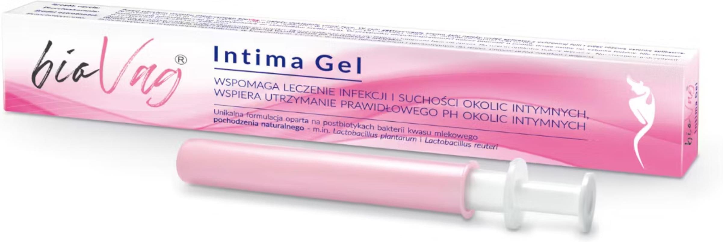 Opis produktu: WYRÓB MEDYCZNY STWORZYNY Z MYŚLĄ O KOBIETACH. bioVag® INTIMA GEL to specjalistyczny kremo-żel dla kobiet, który: zapobiega i wspomaga leczenie infekcji intymnych niweluje suchość i pieczenie pochwy nawilża okolice intymne wspomaga utrzymanie prawidłowego pH okolic intymnych wspomaga regenerację błony śluzowej działa już po 8 godzinach od jednorazowej aplikacji Kremo-żel bioVagTM opiera swoje działanie na unikalnym składniku aktywnym BioFemme ® stanowiącym postbiotyki z bakterii kwasu mlekowego m.in Lactobacillus plantarum oraz Lactobacillus reuteri. Działanie przeciwbakteryjne i przeciwgrzybicze polega na stworzeniu optymalnych warunków rozwoju mikroflory, a zatem na utrzymaniu fizjologicznego, kwaśnego pH. Prawidłowa kondycja mikrobiomu okolic intymnych hamuje nadmierny wzrost patogennych bakterii i grzybów wywołujących stany zapalne, w tym Candida albicans, Pseudomonas aeruginosa, Escherichia coli i Staphylococcus aureus. Preparat hamuje rozwój grzybów Candida albicans oraz bakterii Pseudomonas aeruginosa, Escherichia coli i Staphylococcus aureus już po około 8 godzinach od podania (badania własne producenta). Wspomaga procesy regeneracji błony śluzowej, działa nawilżająco oraz łagodzi objawy swędzenia i pieczenia okolic intymnych. Produkt zawiera znaczne ilości wolnych aminokwasów. bioVagTM przyczynia się do utrzymania równowagi mikroflory bakteryjnej okolic intymnych. Sposób użycia: Jednorazowa aplikacja. Przed użyciem wyrobu medycznego bioVagTM należy dokładnie umyć ręce. W celu zastosowania kremo-żelu należy wyjąć aplikator z ochronnej folii i zdjąć różową osłonkę aplikatora. Następnie przy użyciu tłoczka wycisnąć zawartość aplikatora w całości w miejsce podania (okolice intymne). Zaleca się stosowanie kremo-żelu na noc. Składniki: BioFemme®, kwas hialuronowy, tokoferol, olej słonecznikowy, ekstrakt z cykorii Cicchorium Intybus, regulator kwasowości, woda, stearynian poliglicerolu, stearynian glicerolu, gliceryna, guma ksantanowa, krzemian magnezowo- glinowy, E211, E202. Przeciwskazania: Stwierdzona nadwrażliwość na którykolwiek ze składników kremo-żelu. W przypadku niepełnosprawności należy poprosić o pomoc drugą osobę np. członka rodziny. Nie stosować w przypadku uszkodzenia aplikatora. Ważne wskazówki: Przechowywać w miejscu niedostępnym dla dzieci, w oryginalnym opakowaniu. Przechowywać w temperaturze od 15°C do 25°C, z dala od światła i wilgoci. Producent: Bioticom Stefan Koziorowski Ul. Bytomska 11 01-612 Warszawa