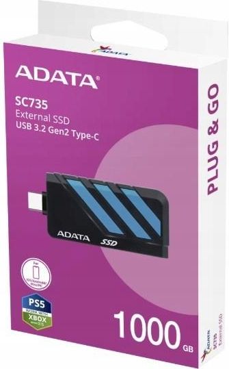 ADATA Dysk SSD External SC735 1TB U3.2C 1000/1000MB/s Blue Klasa wojskowa dla wszystkich Twoich wyzwań SC735 spełnia również normę odporności na uderzenia MIL-STD-810G 516.6, dzięki czemu z łatwością przetrwa przypadkowe upadki i wstrząsy z wysokości 1,22 metra. Ta ochrona chroni Twoje pliki, zapewniając spokój ducha podczas przesyłania plików podczas częstego przebywania na zewnątrz. Szybki odczyt/zapis 1,050/1,000MB/s SC735 wykorzystuje interfejs USB 3.2 Gen2, aby zapewnić wysoką wydajność z prędkością odczytu/zapisu do 1 050/1 000 MB/s. Umożliwia to bezpośredni dostęp i edycję dużych plików na samym dysku. W pełni obsługuje również serię iPhone 15 Pro i nowsze, ułatwiając zarówno standardowe przesyłanie plików, jak i bezpośrednie nagrywanie wideo Apple ProRes. * Aby uzyskać optymalną wydajność, urządzenia muszą obsługiwać sterowniki USB 3.2 Gen 2 i UASP. Rzeczywiste prędkości mogą się różnić w zależności od konfiguracji sprzętu i oprogramowania systemu. Lekka jak piórko konstrukcja, nieobciążona przenośność SC735 wykorzystuje lekką konstrukcję do absolutnych granic wytrzymałości, ważąc zaledwie 13,6 grama - tak lekką, że prawie nie zauważysz jej obecności. Jego wyjątkowo kompaktowy korpus pozwala na bezproblemowe przechowywanie w kieszeni lub portfelu. Zapewnia to prawdziwą przenośność, która podąża za Tobą wszędzie, doskonale spełniając wymagania pracy mobilnej i codziennego życia. Kompaktowy rozmiar, transfer bezprzewodowy Wyposażony w wysuwane złącze USB Type-C, SC735 eliminuje potrzebę stosowania zewnętrznych. Jego kompaktowa i lekka konstrukcja, porównywalna rozmiarami ze standardowym pendrive'em, sprawia, że jest wyjątkowo przenośny do pracy i podróży. Wystarczy rozszerzyć łącznik, aby rozpocząć przesyłanie dużych plików. Twoja biblioteka gier SC735 można podłączyć do konsol do gier najnowszej generacji. Gry, które nie mieszczą się w pamięci wewnętrznej konsoli, można przechowywać w SC735, co ułatwia rozbudowę biblioteki gier i wzbogacenie rozrywkowego stylu życia. Bezproblemowa kompatybilność Niezależnie od tego, czy masz Androida, macOS, Windows, czy inne systemy operacyjne, nie musisz się martwić o kompatybilność. Po prostu podłącz przez port Type-C i gotowe. Model: SC735 Typ dysku: SSD Typ napędu: Zewnętrzny Pojemność dysku: 1 TB Interfejs dysku: USB 3.1/USB 3.1 gen 2/USB 3.2 gen 2 Prędkość odczytu: 1050 MB/s Prędkość zapisu: 1000 MB/s Kolor: Czarny,Niebieski Wysokość: 21.1 mm Szerokość: 28.5 mm Głębokość: 55 mm Waga: 13.6 g