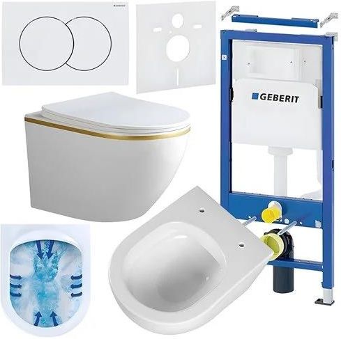 ZESTAW PODTYNKOWY WC STELAŻ GEBERIT DUOFIX MISKA PEAK-WH-GL-RIM-03 PRZYCISK DELTA 01 BIAŁY ZESTAW:ZES-PEAK-48 Zestaw podtynkowy WC Geberit Duofix z wiszącą miską WC PEAK-WH-GL-RIM-03 oraz przyciskiem spłukującym Delta 01 to idealne rozwiązanie dla osób poszukujących eleganckiego i funkcjonalnego systemu do łazienki. System ten charakteryzuje się nowoczesnym designem, który doskonale wpasowuje się w minimalistyczne wnętrza, zapewniając jednocześnie maksymalną oszczędność miejsca. Stelaż podtynkowy umożliwia ukrycie elementów instalacyjnych w ścianie, dzięki czemu łazienka zyskuje na przestronności i estetyce. Miska WC PEAK-WH-GL-RIM-03, wykonana z wysokiej jakości ceramiki sanitarnej, gwarantuje nie tylko elegancki wygląd, ale także łatwość czyszczenia i higienę, co sprawia, że jest to doskonały wybór do nowoczesnych wnętrz. Dodatkowym atutem tego modelu jest zastosowany system Rimless, który rewolucjonizuje sposób spłukiwania toalety. Dzięki innowacyjnej, bezkołnierzowej konstrukcji, woda jest równomiernie rozprowadzana po całej powierzchni miski, co zapewnia skuteczne i dokładne spłukiwanie. Specjalnie zaprojektowana technologia eliminacji miejsc, w których mogą gromadzić się bakterie, gwarantuje wysoki poziom higieny. Przycisk Geberit Delta 01 w kolorze biały stanowi subtelny akcent, który doskonale komponuje się z całością zestawu. Wyposażony w system dwudzielnego spłukiwania, umożliwia oszczędne gospodarowanie wodą, co czyni go ekologicznym wyborem. Całość zestawu została zaprojektowana z myślą o komforcie użytkowania oraz szybkim i bezproblemowym montażu, co sprawia, że jest to niezawodne i długotrwałe rozwiązanie do każdej łazienki. Przycisk spłukujący Geberit Delta 01 to idealne uzupełnienie nowoczesnych łazienek. Wyróżnia się eleganckim, minimalistycznym designem, który doskonale komponuje się z różnymi stylami aranżacji wnętrz. Wykonany z trwałych materiałów, zapewnia długą żywotność bez ryzyka uszkodzeń. Dane techniczneprzycisku Marka: GEBERIT Seria: Delta 01 Kolor: Biały Materiał: Tworzywo sztuczne Maks. siła nacisku (N): 20 N Uruchamianie: Z przodu Szerokość (B): 24,6 cm Długość (H): 16,4 cm Wysokość (T): 2,3 cm Stelaż podtynkowy Geberit Duofix to wytrzymała i łatwa w montażu konstrukcja, idealna do zabudowy w ściankach działowych. Dzięki samonośnej ramie z antykorozyjną powłoką malowaną proszkowo, stelaż jest niezwykle trwały i zapewnia stabilność w każdych warunkach montażowych. Spłuczka z izolacją przeciwwilgociową i systemem dwudzielnego spłukiwania oszczędza wodę, a regulowane nóżki ułatwiają montaż nawet na nierównym podłożu. Dodatkowym atutem zestawu jest mata wygłuszająca, która skutecznie tłumi hałas podczas spłukiwania i korzystania z toalety. Dzięki innowacyjnej konstrukcji mata zapobiega przenoszeniu wibracji na sąsiednie pomieszczenia, co podnosi komfort użytkowania, szczególnie w mieszkaniach, gdzie łazienka znajduje się blisko sypialni lub salonu. Dane techniczne stelaża Marka: GEBERIT Szerokość stelaża: 50 cm Wysokość stelaża: 112 cm Maks. temperatura wody: 25 °C Ustawienia fabryczne ilości wody spłukującej: 6 / 3 l Zakres regulacji spłukiwania dużą ilością wody: 4 / 4.5 / 6 / 7.5 l Zakres regulacji spłukiwania małą ilością wody: 2–4 l Przepływ obliczeniowy: 0.12 l/s Minimalne ciśnienie przepływu dla przepływu obliczeniowego: 50 kPa Regulowana wysokość: tak Mata wygłuszająca w zestawie: tak Dane techniczne miski Marka: Hydrosan Rozmiar: 49x37x36 cm Montaż: wisząca System spłukiwania: Rimless - bezrantowy Materiał: ceramika sanitarna Kolor miski: biały + złoty pasek Materiał deski: duroplast UF Rodzaj deski: wolnoopadająca Kolor deski: biały Wersja slim: tak Łatwe wypinanie: tak Zalety zestawu Kompleksowość: Zestaw zawiera wszystkie niezbędne komponenty do instalacji toalety wiszącej. Jakość: Produkty renomowanej marki Geberit, znane z wysokiej jakości wykonania, trwałości oraz niezawodności. Estetyka: Nowoczesny design i eleganckie wykończenia produktów sprawiają, że zestaw idealnie wpasuje się w każdą łazienkę, nadając jej nowoczesny i estetyczny wygląd. Funkcjonalność: Technologia Rimless w misce WC zapewnia łatwość czyszczenia i utrzymania higieny, eliminując trudnodostępne miejsca. Wolnoopadająca deska zwiększa komfort użytkowania, eliminując hałas oraz ryzyko uszkodzeń. Ekonomia: Dwudzielny przycisk spłukujący pozwala na oszczędność wody, dzięki możliwości wyboru ilości wody do spłukiwania. Regulacja ilości wody spłukującej w stelażu daje dodatkową możliwość oszczędności. Trwałość: Stelaż Geberit Duofix cechuje się solidną konstrukcją, która zapewnia stabilność i trwałość całej instalacji. Dodatkowo, cicha praca spłuczki zwiększa komfort użytkowania. Łatwość montażu: Zestaw jest zaprojektowany z myślą o łatwym i szybkim montażu. Komfort akustyczny: Mata wygłuszającaskutecznie tłumi hałas podczas spłukiwania i korzystania z toalety, zapewniając cichą i dyskretną pracę zestawu. * Uwaga! Rzeczywiste wymiary mogą się różnić od tych podanych w ofercie. Tolerancja błędów może wynosić +/- 5%.
