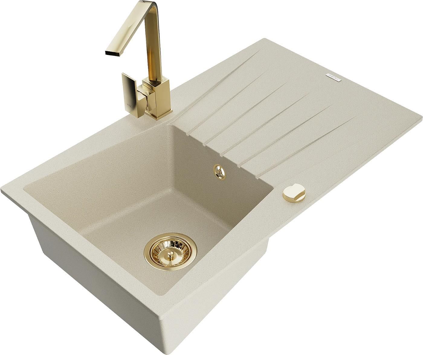 Dane techniczne: Zlewozmywak: Rozmiar: 775x470x200 mm Głębokość komory: 180 mm Wymiary komory: 410x355 mm Średnica odpływu: ø90 mm Typ: 1-komorowy z ociekaczem Rodzaj: Wpuszczany w blat Kolor: Beżowy Wykończenie syfonu: Złoty Materiał: Granit (80% kruszywo granitowe 20% żywice) Otwór przelewowy: Tak Otwory: ( bateria, automat ) 2 Montaż: Uniwersalny, możliwość montażu z ociekaczem po lewej lub prawej stronie Wysoka odporność na zarysowania i przebarwienia Odporność na szok termiczny Powierzchnia ułatwiająca czyszczenie Bateria kuchenna: Materiał: Mosiądz Kolor: Złoty Głowica: Ceramiczna Perlator: Tak Typ: Jednouchwytowa Wysokość baterii: 290 mm Zasięg wylewki: 220 mm