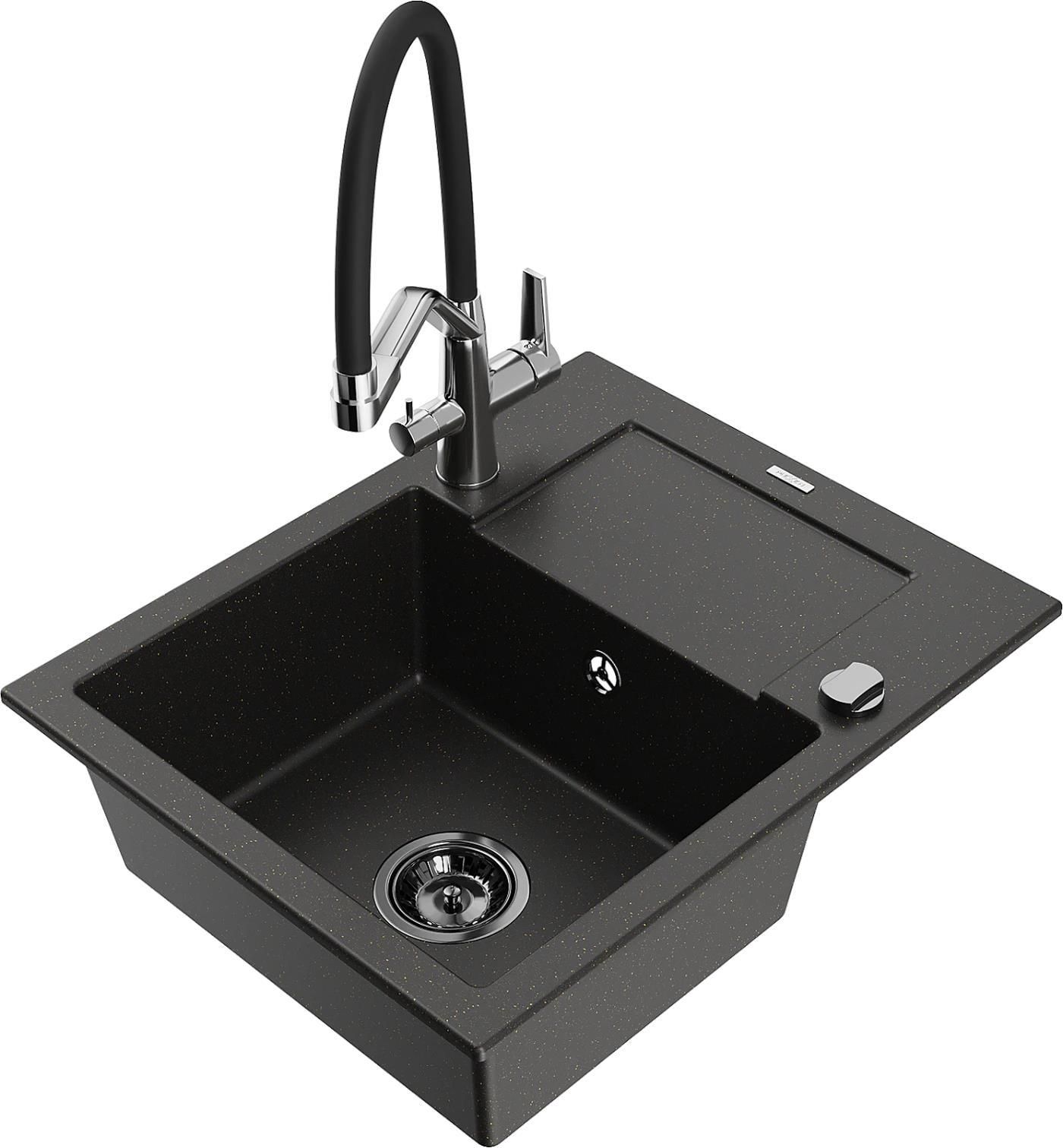 Mexen Enzo zlewozmywak granitowy 1-komorowy z ociekaczem i baterią kuchenną Duo, czarny/złoty metalik - 6506-75-671701-07-B Dane produktu Producent: Mexen Nr katalogowy: 6506-75-671701-07-B Kod EAN: 5905315100306 Cechy produktu Seria: Enzo Dłuższy bok: 576 mm Krótszy bok: 465 mm Typ: Wpuszczany Kształt: Prostokątny Wyciągana wylewka: Tak Wysokość baterii: 40,5 cm Zasięg wylewki: 26 cm Możliwość podłączenia filtra wody: Tak Ilość komór: 1-komorowy Otwory: 2 Podcięcia pod otwory: 2 Ociekacz: Krótki ociekacz Syfon automatyczny: Tak Przelew: Tak Kolor syfonu: Czarny Kolor zlewu: Czarny/Złoty metalik Kolor baterii: Czarny/Chrom Dane techniczne: Zlewozmywak: Rozmiar: 576x465x174 mm Głębokość komory: 164 mm Wymiary komory: 395x320 mm Średnica odpływu: ø90 mm Typ: 1-komorowy z krótkim ociekaczem Rodzaj: Wpuszczany w blat Kolor: Czarny/Złoty metalik Wykończenie syfonu: Czarny Materiał: Granit (80% kruszywo granitowe 20% żywice) Otwór przelewowy: Tak Otwory: ( bateria, automat ) 2 Montaż: Uniwersalny, możliwość montażu z ociekaczem po lewej lub prawej stronie Wysoka odporność na zarysowania i przebarwienia Odporność na szok termiczny Powierzchnia ułatwiająca czyszczenie Dwa dodatkowe podfrezowane otwory do samodzielnego wybicia ø35 Bateria kuchenna: Materiał: Mosiądz Kolor: Chrom/Czarny Głowice: Ceramiczne Perlator: Tak Rodzaj wylewki: Elastyczna z mosiężną podpórką Zasięg wylewki: 260 mm Wysokość: 405 mm Typ: Dwuuchwytowa Bateria dwugłowicowa z dodatkowym kanałem do wody pitnej filtrowanej Jeśli dla Ciebie, tak samo jak i dla nas, wyposażenie łazienki i toalety ma być nie tylko funkcjonalne i ułatwiające życie, ale także ma stanowić ich ozdobę – koniecznie sprawdź naszą ofertę. Jeśli zgadzasz się ze stwierdzeniem, że elegancka funkcjonalność w połączeniu z nowoczesnym designem gwarantuje atrakcyjny wygląd łazienki oraz toalety na długie lata, to trafiłeś we właściwe miejsce. Witaj w świecie MEXEN!