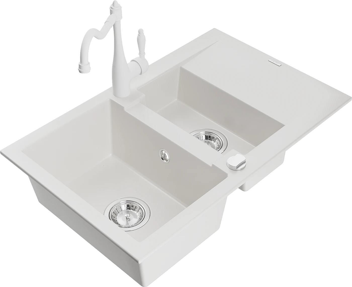 Mexen Gaspar zlewozmywak granitowy 1,5-komorowy z ociekaczem i baterią kuchenną Carla, biały - 6507-20-670700-20 Dane produktu Producent: Mexen Nr katalogowy: 6507-20-670700-20 Kod EAN: 5905315039316 Cechy produktu Seria: Gaspar Dłuższy bok: 737 mm Krótszy bok: 475 mm Typ: Wpuszczany Kształt: Prostokątny Wyciągana wylewka: Nie Wysokość baterii: 29 cm Zasięg wylewki: 26 cm Możliwość podłączenia filtra wody: Nie Ilość komór: 1,5-komorowy Otwory: 2 Podcięcia pod otwory: 0 Ociekacz: Krótki ociekacz Syfon automatyczny: Tak Przelew: Tak Kolor syfonu: Chrom Kolor zlewu: Biały Kolor baterii: Biały Dane techniczne: Zlewozmywak: Rozmiar: 737x475x177 mm Głębokość komory: 167 mm (większa), 107 mm (mniejsza) Wymiary komory: 395x272 mm (większa), (mniejsza) 375x182 mm Średnica odpływu: ø90 mm Typ: 1,5-komorowy z krótkim ociekaczem Rodzaj: Wpuszczany w blat Kolor: Biały Wykończenie syfonu: Chrom Materiał: Granit (80% kruszywo granitowe 20% żywice) Otwór przelewowy: Tak Otwory: ( bateria, automat ) 2 Montaż: Uniwersalny, możliwość montażu z ociekaczem po lewej lub prawej stronie Wysoka odporność na zarysowania i przebarwienia Odporność na szok termiczny Powierzchnia ułatwiająca czyszczenie Bateria kuchenna: Materiał: Mosiądz Kolor: Biały Głowica: Ceramiczna Perlator: Tak Typ: Jednouchwytowa Wysokość baterii: 290 mm Zasięg wylewki: 260 mm Jeśli dla Ciebie, tak samo jak i dla nas, wyposażenie łazienki i toalety ma być nie tylko funkcjonalne i ułatwiające życie, ale także ma stanowić ich ozdobę – koniecznie sprawdź naszą ofertę. Jeśli zgadzasz się ze stwierdzeniem, że elegancka funkcjonalność w połączeniu z nowoczesnym designem gwarantuje atrakcyjny wygląd łazienki oraz toalety na długie lata, to trafiłeś we właściwe miejsce. Witaj w świecie MEXEN!