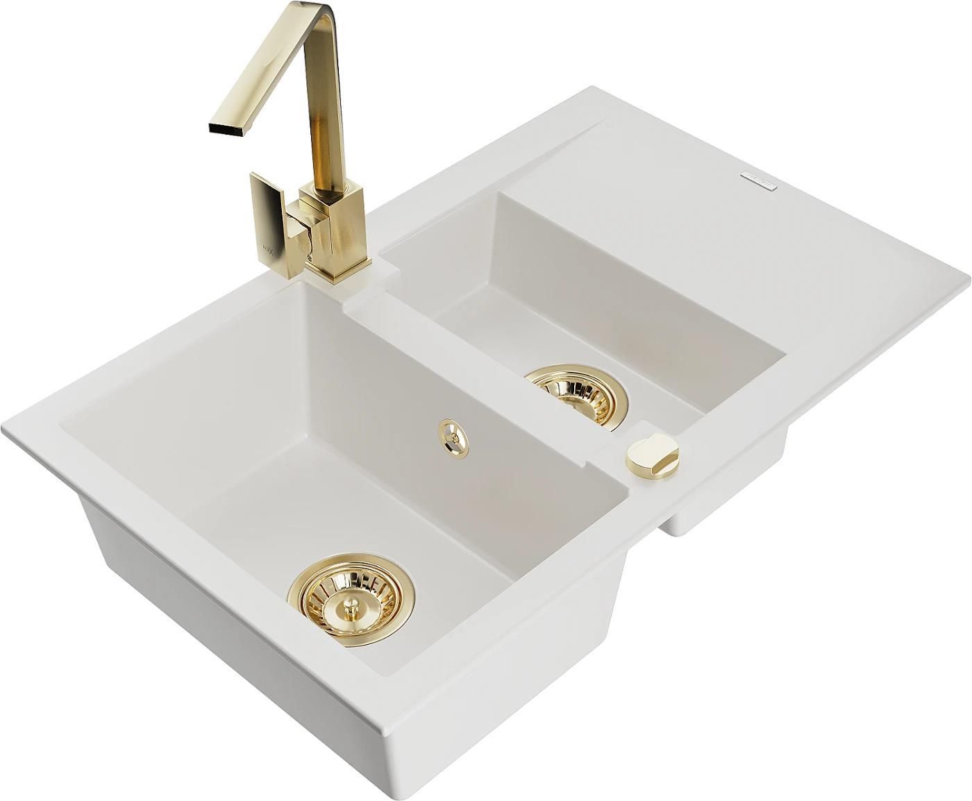 Mexen Gaspar zlewozmywak granitowy 1,5-komorowy z ociekaczem i baterią kuchenną Rita, biały - 6507-20-670300-50 Dane produktu Producent: Mexen Nr katalogowy: 6507-20-670300-50 Kod EAN: 5905315018830 Cechy produktu Seria: Gaspar Dłuższy bok: 737 mm Krótszy bok: 475 mm Typ: Wpuszczany Kształt: Prostokątny Wyciągana wylewka: Nie Wysokość baterii: 29 cm Zasięg wylewki: 22 cm Możliwość podłączenia filtra wody: Nie Ilość komór: 1,5-komorowy Otwory: 2 Podcięcia pod otwory: 0 Ociekacz: Krótki ociekacz Syfon automatyczny: Tak Przelew: Tak Kolor syfonu: Złoty Kolor zlewu: Biały Kolor baterii: Złoty Dane techniczne: Zlewozmywak: Rozmiar: 737x475x177 mm Głębokość komory: 167 mm (większa), 107 mm (mniejsza) Wymiary komory: 395x272 mm (większa), (mniejsza) 375x182 mm Średnica odpływu: ø90 mm Typ: 1,5-komorowy z krótkim ociekaczem Rodzaj: Wpuszczany w blat Kolor: Biały Wykończenie syfonu: Złoty Materiał: Granit (80% kruszywo granitowe 20% żywice) Otwór przelewowy: Tak Otwory: ( bateria, automat ) 2 Montaż: Uniwersalny, możliwość montażu z ociekaczem po lewej lub prawej stronie Wysoka odporność na zarysowania i przebarwienia Odporność na szok termiczny Powierzchnia ułatwiająca czyszczenie Bateria kuchenna: Materiał: Mosiądz Kolor: Złoty Głowica: Ceramiczna Perlator: Tak Typ: Jednouchwytowa Wysokość baterii: 290 mm Zasięg wylewki: 220 mm Jeśli dla Ciebie, tak samo jak i dla nas, wyposażenie łazienki i toalety ma być nie tylko funkcjonalne i ułatwiające życie, ale także ma stanowić ich ozdobę – koniecznie sprawdź naszą ofertę. Jeśli zgadzasz się ze stwierdzeniem, że elegancka funkcjonalność w połączeniu z nowoczesnym designem gwarantuje atrakcyjny wygląd łazienki oraz toalety na długie lata, to trafiłeś we właściwe miejsce. Witaj w świecie MEXEN!