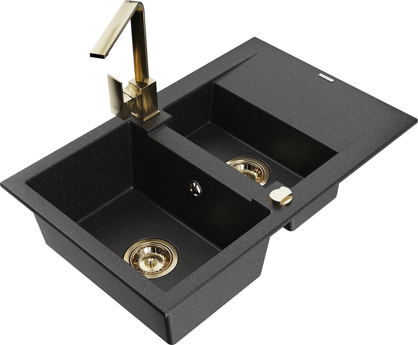 Mexen Gaspar zlewozmywak granitowy 1,5-komorowy z ociekaczem i baterią kuchenną Rita, czarny/srebrny metalik - 6507-73-670300-50 Dane produktu Producent: Mexen Nr katalogowy: 6507-73-670300-50 Kod EAN: 5905315018953 Cechy produktu Seria: Gaspar Dłuższy bok: 737 mm Krótszy bok: 475 mm Typ: Wpuszczany Kształt: Prostokątny Wyciągana wylewka: Nie Wysokość baterii: 29 cm Zasięg wylewki: 22 cm Możliwość podłączenia filtra wody: Nie Ilość komór: 1,5-komorowy Otwory: 2 Podcięcia pod otwory: 0 Ociekacz: Krótki ociekacz Syfon automatyczny: Tak Przelew: Tak Kolor syfonu: Złoty Kolor zlewu: Czarny/Srebrny metalik Kolor baterii: Złoty Dane techniczne: Zlewozmywak: Rozmiar: 737x475x177 mm Głębokość komory: 167 mm (większa), 107 mm (mniejsza) Wymiary komory: 395x272 mm (większa), (mniejsza) 375x182 mm Średnica odpływu: ø90 mm Typ: 1,5-komorowy z krótkim ociekaczem Rodzaj: Wpuszczany w blat Kolor: Czarny/Srebrny metalik Wykończenie syfonu: Złoty Materiał: Granit (80% kruszywo granitowe 20% żywice) Otwór przelewowy: Tak Otwory: ( bateria, automat ) 2 Montaż: Uniwersalny, możliwość montażu z ociekaczem po lewej lub prawej stronie Wysoka odporność na zarysowania i przebarwienia Odporność na szok termiczny Powierzchnia ułatwiająca czyszczenie Bateria kuchenna: Materiał: Mosiądz Kolor: Złoty Głowica: Ceramiczna Perlator: Tak Typ: Jednouchwytowa Wysokość baterii: 290 mm Zasięg wylewki: 220 mm Jeśli dla Ciebie, tak samo jak i dla nas, wyposażenie łazienki i toalety ma być nie tylko funkcjonalne i ułatwiające życie, ale także ma stanowić ich ozdobę – koniecznie sprawdź naszą ofertę. Jeśli zgadzasz się ze stwierdzeniem, że elegancka funkcjonalność w połączeniu z nowoczesnym designem gwarantuje atrakcyjny wygląd łazienki oraz toalety na długie lata, to trafiłeś we właściwe miejsce. Witaj w świecie MEXEN!