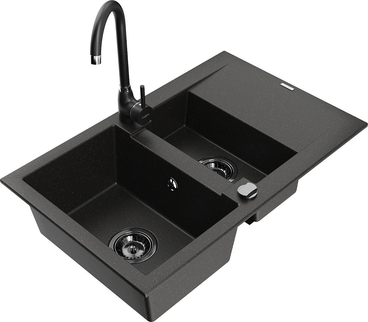 Mexen Gaspar zlewozmywak granitowy 1,5-komorowy z ociekaczem i baterią kuchenną Telma, czarny/złoty - 6507-75-670200-70-B Dane produktu Producent: Mexen Nr katalogowy: 6507-75-670200-70-B Kod EAN: 5905315014856 Cechy produktu Seria: Gaspar Dłuższy bok: 737 mm Krótszy bok: 475 mm Typ: Wpuszczany Kształt: Prostokątny Wyciągana wylewka: Nie Wysokość baterii: 33,5 cm Zasięg wylewki: 18 cm Możliwość podłączenia filtra wody: Nie Ilość komór: 1,5-komorowy Otwory: 2 Podcięcia pod otwory: 0 Ociekacz: Krótki ociekacz Syfon automatyczny: Tak Przelew: Tak Kolor syfonu: Czarny Kolor zlewu: Czarny/Złoty metalik Kolor baterii: Czarny Dane techniczne: Zlewozmywak: Rozmiar: 737x475x177 mm Głębokość komory: 167 mm (większa), 107 mm (mniejsza) Wymiary komory: 395x272 mm (większa), (mniejsza) 375x182 mm Średnica odpływu: ø90 mm Typ: 1,5-komorowy z krótkim ociekaczem Rodzaj: Wpuszczany w blat Kolor: Czarny/Złoty metalik Wykończenie syfonu: Czarny Materiał: Granit (80% kruszywo granitowe 20% żywice) Otwór przelewowy: Tak Otwory: ( bateria, automat ) 2 Montaż: Uniwersalny, możliwość montażu z ociekaczem po lewej lub prawej stronie Wysoka odporność na zarysowania i przebarwienia Odporność na szok termiczny Powierzchnia ułatwiająca czyszczenie Bateria kuchenna: Materiał: Mosiądz Kolor: Czarny Głowica: Ceramiczna Perlator: Tak Typ: Jednouchwytowa Wysokość baterii: 335 mm Zasięg wylewki: 180 mm Jeśli dla Ciebie, tak samo jak i dla nas, wyposażenie łazienki i toalety ma być nie tylko funkcjonalne i ułatwiające życie, ale także ma stanowić ich ozdobę – koniecznie sprawdź naszą ofertę. Jeśli zgadzasz się ze stwierdzeniem, że elegancka funkcjonalność w połączeniu z nowoczesnym designem gwarantuje atrakcyjny wygląd łazienki oraz toalety na długie lata, to trafiłeś we właściwe miejsce. Witaj w świecie MEXEN!