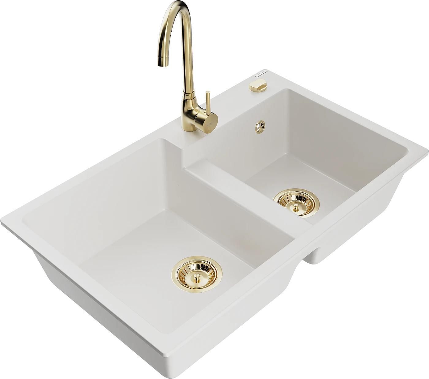 Mexen Tomas zlewozmywak granitowy 2-komorowy z baterią kuchenną Telma, biały - 6516-20-670200-50 Dane produktu Producent: Mexen Nr katalogowy: 6516-20-670200-50 Kod EAN: 5905315015952 Cechy produktu Seria: Tomas Dłuższy bok: 800 mm Krótszy bok: 500 mm Typ: Wpuszczany Kształt: Prostokątny Wyciągana wylewka: Nie Wysokość baterii: 33,5 cm Zasięg wylewki: 18 cm Możliwość podłączenia filtra wody: Nie Ilość komór: 2-komorowy Otwory: 2 Podcięcia pod otwory: 1 Ociekacz: Bez ociekacza Syfon automatyczny: Tak Przelew: Tak Kolor syfonu: Złoty Kolor zlewu: Biały Kolor baterii: Złoty Dane techniczne: Zlewozmywak: Rozmiar: 800x500x190 mm Głębokość komory: 180 mm (większa), 180 mm (mniejsza) Wymiary komory: 440x387 mm (większa), 370x303 mm (mniejsza) Średnica odpływu: ø90 mm Typ: 2-komorowy Rodzaj: Wpuszczany w blat Kolor: Biały Wykończenie syfonu: Złoty Materiał: Granit (80% kruszywo granitowe 20% żywice) Otwór przelewowy: Tak Otwory: ( bateria, automat ) 2 Wysoka odporność na zarysowania i przebarwienia Odporność na szok termiczny Powierzchnia ułatwiająca czyszczenie Jeden dodatkowy podfrezowany otwór do samodzielnego wybicia ø35 Bateria kuchenna: Materiał: Mosiądz Kolor: Złoty Głowica: Ceramiczna Perlator: Tak Typ: Jednouchwytowa Wysokość baterii: 335 mm Zasięg wylewki: 180 mm Jeśli dla Ciebie, tak samo jak i dla nas, wyposażenie łazienki i toalety ma być nie tylko funkcjonalne i ułatwiające życie, ale także ma stanowić ich ozdobę – koniecznie sprawdź naszą ofertę. Jeśli zgadzasz się ze stwierdzeniem, że elegancka funkcjonalność w połączeniu z nowoczesnym designem gwarantuje atrakcyjny wygląd łazienki oraz toalety na długie lata, to trafiłeś we właściwe miejsce. Witaj w świecie MEXEN!
