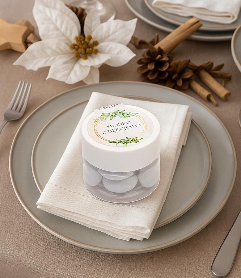 Zestaw 5 eleganckich słoiczków z mentosami miętowymi – idealne podziękowanie dla gości weselnych Szukasz subtelnego i gotowego upominku dla gości weselnych? Te małe słoiczki z miętowymi mentosami i etykietą „Słodko dziękujemy!” to stylowy dodatek, który świetnie sprawdzi się jako podziękowanie na stołach lub przy wyjściu z sali. Co zawiera zestaw? • 5 sztuk mini słoiczków z mentosami o smaku miętowym • Każdy słoiczek posiada elegancką naklejkę „Słodko dziękujemy!” (projekt etykiety nie podlega zmianie) • Masa netto mentosów w jednym słoiczku: 21 g • Gotowy do wręczenia prezent dla gości weselnych Wymiary jednego słoiczka • Średnica: 4 cm • Wysokość całkowita (z nakrętką): 3,5 cm • Tworzywa: PET (słoiczek), PP (nakrętka) – lekkie, bezpieczne, estetyczne Zawartość Mentosy o delikatnym miętowym smaku – świeże i orzeźwiające, idealne jako oddech po weselnym posiłku. Składniki cukier, syrop glukozowy, olej kokosowy, skrobia, tłuszcz kakaowy, naturalne aromaty miętowe, maltodekstryna, substancje zagęszczające (guma gellan, guma celulozowa, guma arabska), emulgator (estry sacharozy i kwasów tłuszczowych), substancja glazurująca (wosk carnauba). Idealne na wesele jako • podziękowanie dla gości weselnych • dodatek do winietki lub prezentu stołowego • upominek wręczany przy wyjściu z sali Estetyczne, gotowe do użycia, zapakowane z klasą. Zestaw zawiera 5 sztuk.