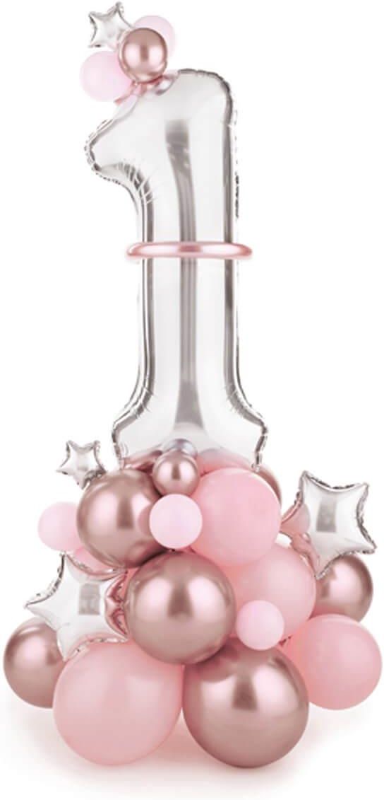 Stoik balonowy na roczek różowy Balonowy stroik do samodzielnego nadmuchania i złożenia. Bukiet balonowy jest w kolorze różowym i srebrnym. Świetnie się sprawdzi jako ozdoba urodzinowa na roczek dla dziecka. Dmuchanie, komponowanie i składanie stroika dostarcza mnóstwo radości, a sam stroik później cieszy oko. Elementy można komponować ze sobą na różne sposoby. Do nadmuchania powietrzem. Ilość sztuk w opakowaniu: 1 komplet Kolor: srebrny, różowy Materiał: folia, lateks Wymiary: 90x104 cm Przeznaczenie: powietrze Zestaw zawiera: 1 balon foliowy duża cyfra 1, 2 balony foliowe gwiazdki duże, 2 balony foliowe gwiazdki małe, 5 balony modeliny, 28 balony lateksowe w różnych rozmiarach, 1 słomka papierowa, 1 taśma do girland o długości 2,5m, 10 sztuk taśm piankowych