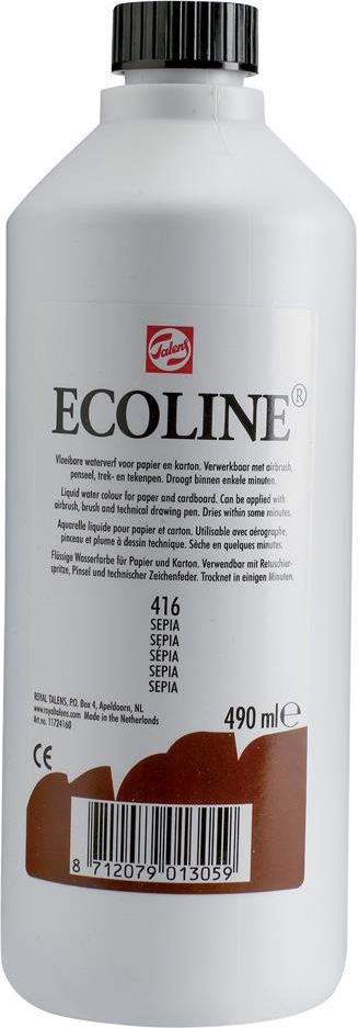 Talens Ecoline skoncentrowana farba akwarelowa w stanie płynnym odznacza się wspaniałą przyswajalnością do papieru akwarelowego, rysunkowego lub tektury Ecoline to wszechstronność w użyciu w połączeniu z różnego rodzaju materiałami; doskonale nadaje się do prac projektowych, do lawowania prace powinny być przechowywane z dala od światła aby zapobiec utracie kolorów doskonale sprawdza się w malarstwie akwarelowym, ale także w rysunku architektonicznym, i wszelkich technikach hobby znakomicie nadaje się do znakowania i pieczętowania opakowanie: butelka pojemność: 490 ml kolor(nr/barwa): 416 sepia produkt holenderskiej firmy Talens