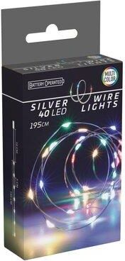 Lampki choinkowe LED na drucikach na baterie CHRISTMAS DECORATIONS. Girlanda 40 LED multikolor, które sprawdzi się do ozdoby lub podświetlenia wszelkich przedmiotów wewnątrz pomieszczeń. 40 lampek LED wkomponowanych w cienki elastyczny srebrny drucik, można ułożyć z niego dowolne kształty. Lampki zasilane są 3 bateriami AA 1,5 V (brak w zastawie). Długość drucika z diodami: 195 cm. Długość całkowita ok.: 212,5 cm. Rozmieszczenie Diod: co 5 cm.