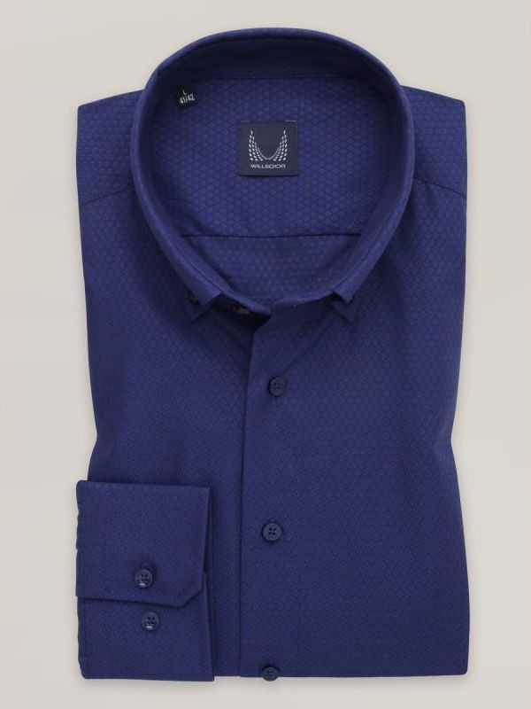 Granatowa taliowana koszula w drobne romby z podpinanym kołnierzykiem, 100% bawełna