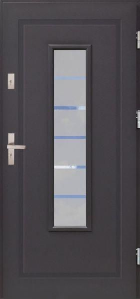 Drzwi wejściowe z kolekcji MARIO charakteryzuje się prostokątnym tłoczeniem na powierzchni skrzydła, wykończonym ramką PCV.