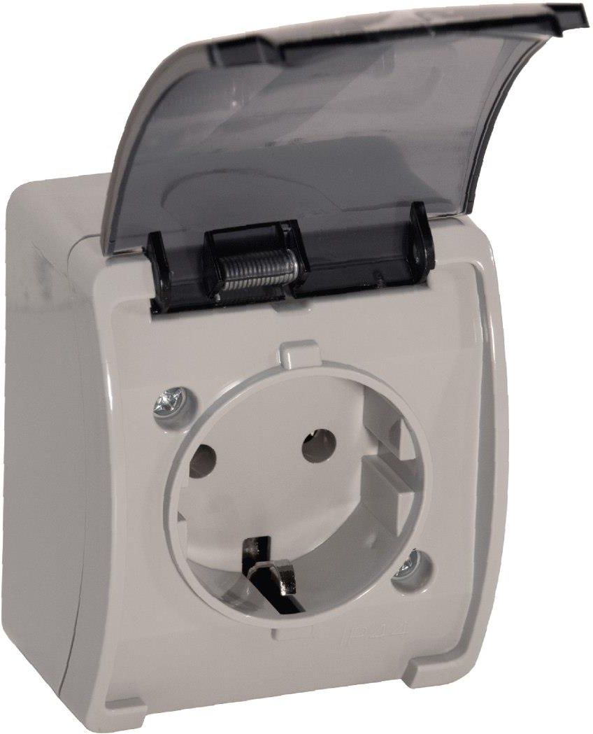 Gniazdo pojedyncze 2P+Z Schuko AQUATIC, IP44, szaro-grafitowe, 10 szt. Gniazdo pojedyncze z uziemieniem typu F (Schuko), przeznaczone do monta?u natynkowego. Produkt posiada praktyczn? klapk?, kt?ra chroni wn?trze gniazda przez bezpo?rednim dost?pem py??w i wody, dzi?ki czemu gniazdo mo?e by? r?wnie? montowane w pomieszczeniach o podwy?szonej wilgotno?ci, takich jak kuchnia czy ?azienka. Produkt wykonany jest z wysokogatunkowego tworzywa sztucznego i wyst?puje w 3 kolorach: bia?ym, czarnym lub szaro-grafitowym. Posiada klas? szczelno?ci IP44, wi?c mo?e by? stosowany zar?wno wewn?trz, jak i na zewn?trz. 10 szt.
