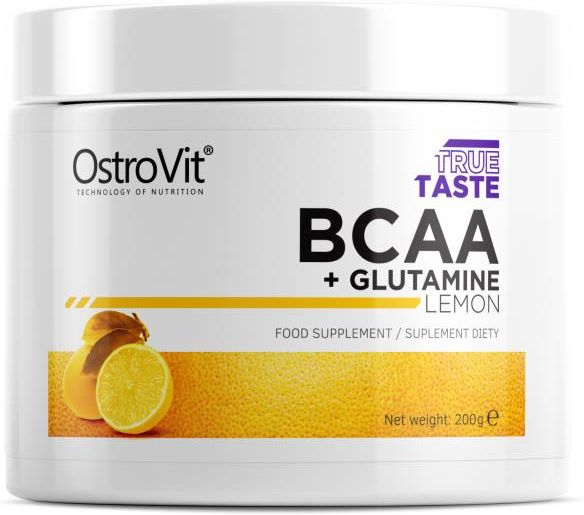 OstroVit BCAA + Glutamine 200g OstroVit BCAA + Glutamine to najwyższej klasy preparat dla osób aktywnych fizycznie, składający się z trzech aminokwasów rozgałęzionych, jakimi są: leucyna, walina, izoleucyna oraz niezwykle istotnej glutaminy. Suplement pochodzi z owocowej serii TRUE TASTE a jego mikronizacja stoi na najwyższym poziomie. Idealna biodostępność i doskonała rozpuszczalność produktu, zostały podyktowane wysokimi wymaganiami konsumentów. BCAA (Branched-Chain Amino Acids): BCAA to grupa aminokwasów, która składa się z trzech aminokwasów o rozgałęzionych łańcuchach bocznych: leucyny, izoleucyny i waliny. Są to aminokwasy egzogenne, co oznacza, że organizm nie jest w stanie ich samodzielnie syntetyzować i muszą być dostarczone z pożywieniem lub suplementami. BCAA stanowią około 35% aminokwasów w białku mięśniowym. Wpływają na wzrost i regenerację mięśni, a także mogą pomóc w zmniejszeniu uczucia zmęczenia podczas treningów. Glutamina: Glutamina to aminokwas, który może być syntetyzowany przez organizm i jest obecny w dużej ilości w mięśniach i krwi. Pełni ważną rolę w funkcjonowaniu układu odpornościowego oraz w przemianie azotu i transportu amoniaku. Po intensywnym treningu poziomy glutaminy w organizmie mogą spaść, dlatego niektórzy sportowcy i osoby aktywne decydują się na jej suplementację w celu wsparcia regeneracji mięśni i układu odpornościowego. Sposób użycia: Porcję 10 g (2.5 miarki) wymieszać w 100 - 150 ml wody lub soku.