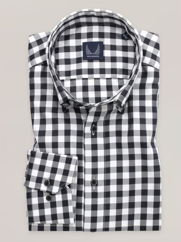 Taliowana koszula w czarną i białą kratę z podpinanym kołnierzykiem
