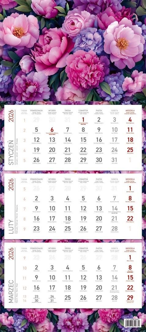 Kalendarz 2026 ścienny trójdzielny, kwiaty Skwierzyna