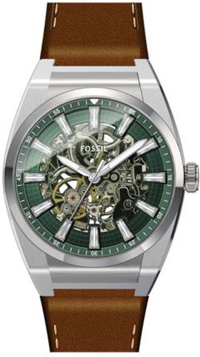 MĘSKI ZEGAREK FOSSIL ME3261 EVERETT AUTOMATIC BRĄZOWY NA PASKU NEOBRITE Zegarki Fossil dzięki swojej oryginalnej stylistyce, szybko zyskały swoją rzeszę fanów. Doskonałym przykładem jakości do ceny jest model ME3261. Fabrycznie nowy, oryginalny Fossil ME3261 to klasyczny męski zegarek typu skeleton, który zachwyca zarówno stylistyką, jak i zaawansowaną technologią. Wyróżnia go przeszklona tarcza i przeszklony dekielek, umożliwiają obserwacje pracy mechanizmu. Komponenty zegarka powstały przy wykorzystaniu najwyższej jakości materiałów takich jak stal szlachetna, odporna na korozję oraz wysokiej jakości skóra naturalna. Opis zegarka Mechanizm: automatyczny, 21 kamieni. Mechanizm czerpie energię z ruchu ręki. Możliwość ręcznego nakręcania. Zegarek nie wymaga wymiany baterii, dzięki pracy automatycznego naciągu. Koperta: wykonana ze stali szlachetnej wysokiej jakości, która charakteryzuje się najwyższym stopniem odporności na korozję. Szkiełko: szkiełko mineralne - wysokiej jakości, które jest odporne na zarysowania - płaskie. Pasek: ze skóry wysokiej jakości. Wodoszczelność: klasa wodoszczelności - 5ATM. Odporny na deszcz i zachlapania. Neobrite: fosforyzowane wskazówki i indeksy, świecące w ciemności. Kolorystyka koperta: srebrna tarcza: srebrna z dodatkiem zielonego, transparentna pasek: brązowy wskazówki: srebrno-białe Automatyczny mechanizm zegarka jest jego największym atutem. Ruchy ręką sprawiają, że zegarek pracuje. Dodatkowo, jest możliwość dokręcania go, poprzez kręcenie koronką. Czasomierz posiada stalową, srebrną, błyszczącą kopertę, która łączy się ze skórzanym paskiem w kolorze brązowym. Dzięki zastosowaniu elementów pokrytych fosforyzująca powłoką neobrite wskazówki i indeksy modelu ME3261 po uprzednim naświetleniu będą świecić przez jakiś czas, ułatwiając odczytanie wskazań zegarka nawet w ciemności. Wymiary koperta : szerokość 42mm, wysokość 50mm tarcza : średnica 36mm szerokość paska: 18mm grubość zegarka: 14mm obwód zegarka od 16,5cm do 22cm W zamówieniu otrzymasz fabrycznie nowy i oryginalny zegarek oryginalne pudełko, dzięki któremu zegarek idealnie sprawdzi się jako prezent kartę gwarancyjną wraz z potwierdzeniem zamówienia książeczkę od producenta (jeżeli takową producent załączył)