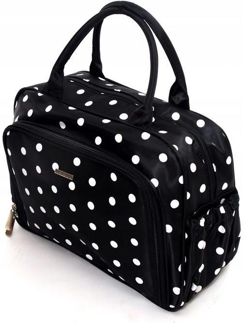 Kosmetyczka Modern M005 marki NOBLE. Posiada kształt poręcznego kuferka z materiałową rączką do transportu o klasycznym wzorze w białe groszki na czarnym tle. Składa się z jednej głównej komory z twardym, rozkładanym dnem oraz z siateczkową kieszonką zamykaną na zamek. Jednocześnie na zewnątrz posiada dodatkową mniejszą komorę zamykaną na zamek błyskawiczny, która kryje w sobie gumeczki na 7 pędzli oraz kolejną siateczkową kieszonkę na zameczek. Kosmetyczka pomieści wszelkie niezbędne kosmetyki, produkty pielęgnacyjne i higieniczne oraz mniejsze urządzenia jak suszarka czy depilator, dzięki czemu jest idealna w czasie podróży. Kosmetyczka. Ma kształt kuferka.Na kosmetyki i akcesoria. Idealna dla młodszych i starszych osób.