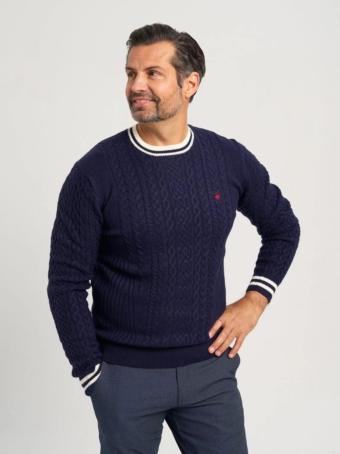 Sweter męski Beverly Hills Polo Club Kolor: granatowy w warkocze Dekolt: okrągły (typ O-neck) Skład: 70% akryl, 30% nylon Białe, kontrastowe paski przy szyi i na mankietach Rękawy wykończone ściągaczem Dół wykończony ściągaczem Elastyczna tkanina, prosty fason Klasyczny ścieg w warkocze Producent: Beverly Hills Polo Club Jakość: pierwsza Gwarancja: 24 m-ce
