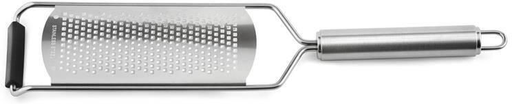 Weis - Tarka drobne oczka Gourmet Tarka Gourmet w całości wykonana jest z wysokiej jakości stali nierdzewnej. Powierzchnia trąca posiada ostrza, które zostały naostrzone przy użyciu nowoczesnej metody, jakim jest zaostrzanie krawędzi laserem. Gwarantuje to niebywałą i długotrwałą ostrość, co z kolei przekłada się na efektywność ścierania. Prezentowana tarka posiada drobne ostrza, które są doskonałe do ścierania warzyw oraz sera. Komfort pracy poprawia antypoślizgowy wspornik, który pozwala wygodnie oprzeć ją na blacie podczas ścierania. Ergonomiczna, stalowa rękojeść zakończona jest otworem, umożliwiającym przechowywanie tarki na haczyku. Do tarki dołączona jest osłona zabezpieczająca ostrze. Tarkę bardzo łatwo jest utrzymać w czystości, można ją myć w zmywarce, jednak rekomendujemy mycie ręczne. Wymiary: 31,5 cm x 6,5 cm x 2 cm.