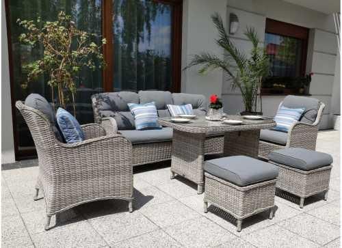 Wszystkie wybarwienia kompletu można zobaczyć na ekspozycji sklepu stacjonarnego. BelGiardino - meble ogrodowe z technorattanuDzięki zdobytemu na przestrzeni lat doświadczeniu jesteśmy w stanie dostarczyć główne elementy aranżacji ogrodów, tarasów oraz balkonów. Z roku na rok staramy się dopracowywać naszą kolekcję, odpowiadając na potrzeby klientów i zmieniające się trendy. Polecamy wysokiej jakości meble ogrodowe z technorattanu, które w każdej chwili dostosować można do aktualnych potrzeb. Skład kompletu jeden stół prostokątny z blatem z hartowanego szkła o grubości 5mm; dwa fotele z poduszkami w kolorze SZARY i o grubości 10cm; jedna kanapa z poduszkami w kolorze SZARY i o grubości 10cm; dwa podnóżki z poduszkami w kolorze SZARY i o grubości 10cm; opcjonalny dodatkowy pokrowiec w kolorze GRAFIT. Zalety kompletu odporność na działanie promieni UV; odporność na warunki atmosferyczne; elegancka plecionka; niepowtarzalne wzornictwo; wzmocniona konstrukcja stelaża; rama aluminiowa, malowana proszkowo; dodatkowe wzmocnienia zapewniają długotrwałą wygodę i komfort użytkowania mebli ogrodowych. Materiały i wykonanieKomplet mebli ogrodowych ARES marki BelGiardino jest wykonany z OKRĄGŁEGO oraz PÓŁOKRĄGŁEGO technorattanu w kolorze JASNY SZARY i o grubości 6mm, który jest doskonałą imitacją naturalnego rattanu. lekkie stelaże są wykonane z aluminium malowanego proszkowo; konstrukcja mebli ogrodowych jest ręcznie opleciona wspomnianym rattanem PE, co potęguje efekt naturalności; technorattan cechuje się wyjątkową lekkością oraz wytrzymałością na warunki atmosferyczne, takie jak deszcz i śnieg; dzięki zastosowaniu nowego, syntetycznego materiału uzyskano doskonałą jakość oraz wytrzymałość; w komplecie znajdują się poduszki, które wytworzono z wodoodpornego materiału. Zapewniają one komfortowe użytkowanie zestawu; wszystkie pokrowce na poduszki są zaimpregnowane, dzięki czemu są odporne na warunki atmosferyczne oraz poplamienia, dzięki czemu przypadkowo wylane napoje nie stanowią już żadnego problemu; zastosowany zamek błyskawiczny daje możliwość szybkiego zdjęcia i wyczyszczenia każdej poszewki. UwagaW wyniku działania promieni słonecznych oraz wysokich temperatur może występować efekt "falującego" rattanu na blacie stołu. Dzieje się tak z powodu skupiania energii słonecznej przez szybę. Efekt ten jest odwracalny - obniżenie temperatury skutkuje natychmiastowym powrotem do pierwotnego stanu. Zalecamy ustawić zestaw pod zadaszeniem lub w zacienionym miejscu.