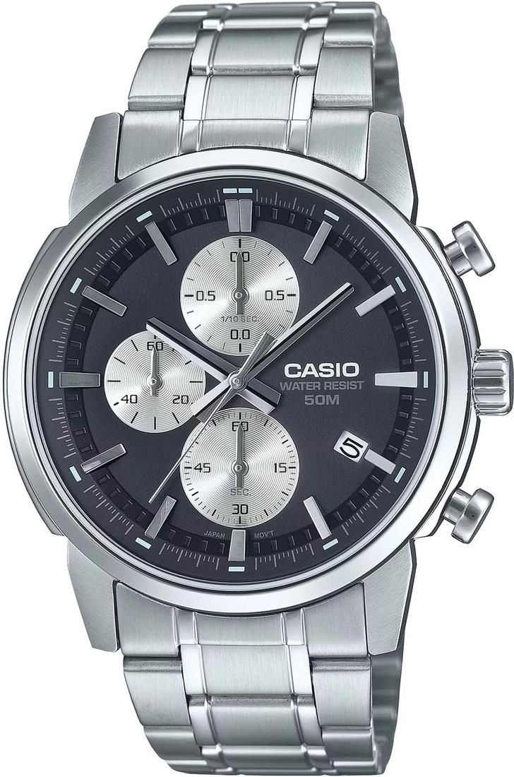 OPIS Zegarek Męski Casio MTP-E510D-1A2 to połączenie męskiego charakteru, nowoczesnego designu i niezawodnej funkcjonalności. Ten czasomierz to idealny wybór dla mężczyzn, którzy cenią sobie styl, ale nie chcą rezygnować z praktyczności. Jego duża, okrągła tarcza w kolorze czerni, ozdobiona wyraźnymi indeksami i kontrastującymi srebrzystymi wskazówkami, przyciąga uwagę swoją czytelnością i elegancją. Koperta ze stali szlachetnej dodaje zegarkowi solidności, a jednocześnie sprawia, że prezentuje się on niezwykle stylowo zarówno w pracy, jak i podczas codziennych aktywności. Wygodna bransoleta ze stali szlachetnej, dopasowana do koperty, nie tylko zapewnia komfort noszenia, ale także podkreśla nowoczesny i zarazem klasyczny charakter zegarka. Dzięki wodoodporności do 50M, MTP-E510D-1A2 jest gotowy na różne warunki, a precyzyjny mechanizm kwarcowy gwarantuje niezawodność i dokładność przez cały czas. To zegarek, który nie tylko pokazuje godzinę, ale także podkreśla Twój indywidualny styl i dodaje Ci pewności siebie w każdej sytuacji. Casio MTP-E510D-1A2 to więcej niż zegarek – to wyraz męskiego charakteru i dbałości o detale. Niezależnie od tego, czy szukasz praktycznego dodatku na co dzień, czy prezentu dla kogoś wyjątkowego, ten zegarek stanie się niezastąpionym elementem Twojej kolekcji. Postaw na styl, który nigdy nie wychodzi z mody – postaw na Casio MTP-E510D-1A2. SPECYFIKACJA Mechanizm: kwarcowy Koperta i bransoleta ze stali szlachetnej Szkło: mineralne FUNKCJE: Datownik - dzień miesiąca Wodoszczelność klasy WR50 Stoper Podświetlenie Chronograf WYMIARY: szerokość koperty: 42 mm grubość koperty: 11 mm szerokość bransolety: 20 mm maksymalny obwód: ok. 20 cm KOLORYSTYKA tarcza: czarna bransoleta: srebrna koperta: srebrna W zestawie pudełko ozdobne Casio