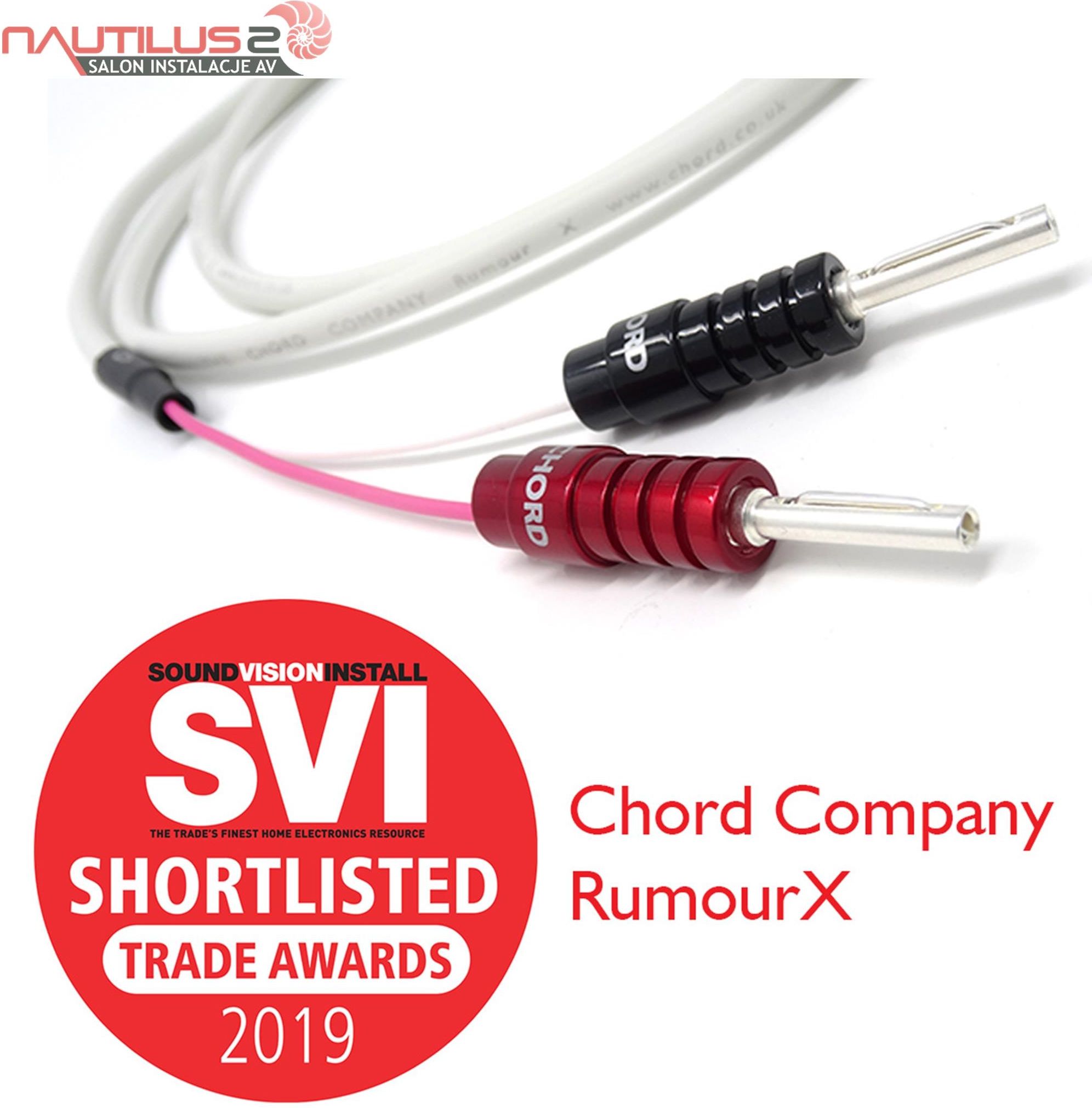 Chord Rumour X – kabel głośnikowy. Konfekcja na firmowych wtykach bananowych ChordOhmic. Kabel ten jest częścią oferty Chord od ponad dwudziestu lat. Rumor X to neutralny, naturalny kabel głośnikowy o dyskretnym wyglądzie - idealny do wielu zastosowań. Wystarczająco dobry, aby znaleźć miejsce w każdym systemie, od lifestyle po naprawdę wysokiej klasy hi-fi. Najlepszy wybór dla każdej wysokiej jakości instalacji audio-wideo. Wyjątkowa technologia w dyskretnej formie. Wypróbowane, przetestowane i zalecane przez producentów audio, instalatorów systemów typu „custom i melomanów.Chord Rumor był naszym drugim podejściem do kabla głośnikowego. Pierwszymi produktami były modele Myth oraz Legend – płaskie kable z miedzi z polietylenowym dielektrykiem, w klasycznej konfiguracji i w wersji bi-wiring. Badaliśmy kable głośnikowe, w których zastosowaliśmy posrebrzane przewodniki w połączeniu z izolacją PTFE. Eksperymentowaliśmy z konfiguracjami skrętek, ponieważ w tym czasie równolegle ustawione przewody o dużej średnicy były standardem dla kabli głośnikowych. Skręcając ze sobą przewodniki, mogliśmy usłyszeć, jak obniża się poziom szumów w systemie. Kiedy osiągnęliśmy idealny współczynnik skrętu, byliśmy gotowi do tego projektu.Kiedy w 1996 roku wprowadziliśmy na rynek model Chord Rumor, był to jeden z najmniej rzucających się w oczy kabli głośnikowych. Sprzedawcy zabierali go do swoich pokojów demonstracyjnych, patrząc na niego podejrzliwie, a wychodzili z nich zaskoczeni i zachwyceni. Brzmiał o wiele lepiej niż wyglądał, świetnie oddając szczegóły i dynamikę. Był też bardziej spójny niż jakikolwiek inny kabel w tym zakresie cenowym. Gdy ludzie przyzwyczaili się do jego rozmiarów i słuchali, a nie patrzyli, stał się bardzo popularnym wyborem. Oprócz zmian kosmetycznych jego konstrukcja pozostawała niezmieniona przez wiele lat.Jego średnica, kolor dielektryka i jakość dźwięku powodują, że wciąż jest bardzo popularnym kablem. Ekranowany kabel głośnikowy Chord Shawline korzysta z tych samych przewodników.Poprzednie wersje modelu Rumor korzystały z izolacji PTFE (znaną również pod nazwą Teflon) i do czasu pojawienia się Taylonu był to materiał, z którego często korzystaliśmy. Choć drogi, PTFE oferował najlepszy stosunek jakości do ceny.Tyle tylko, że technologia materiałowa stale się rozwija, a obecnie dostępne są ciekawe zamienniki dla PTFE. Ponieważ wysoki koszt wytworzenia Taylonu uniemożliwia nam stosowanie go we wszystkich naszych seriach, udało nam się znaleźć odpowiednią rodzinę materiałów izolacyjnych, które mogą go zastąpić, znanych jako XLPE (usieciowany polietylen). Jedna z wersji tego materiału wyglądała szczególnie interesująco i po testach odsłuchowych okazała się wyraźnie lepsza niż PTFE. Dlatego zastosowaliśmy ją w nowym kablu głośnikowym Rumor, obecnie znanym jako Rumor X. Specyfikacja techniczna