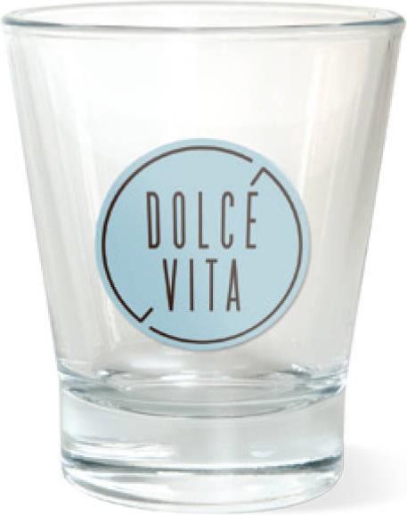 Szklana szklaneczka na wodę z logo palarni Dolce Vita z Brescii. Doskonale nadaje się na wodę do popicia espresso. Pojemność: 70ml