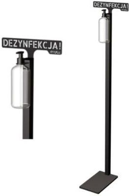 STOJAK + BUTELKA NA PŁYN DO DEZYNFEKCJI Z NAPISEM, CZARNY MAT Wymiary: 150 mm x 1200 mm x 260 mm - Produkt wykonany jest z wysokiej jakości stali nierdzewnej malowanej na czarno termoutwardzalną farbą proszkową - kolor czarny RAL 9005 - matowy - Produkt objęty jest pięcioletnią gwarancją