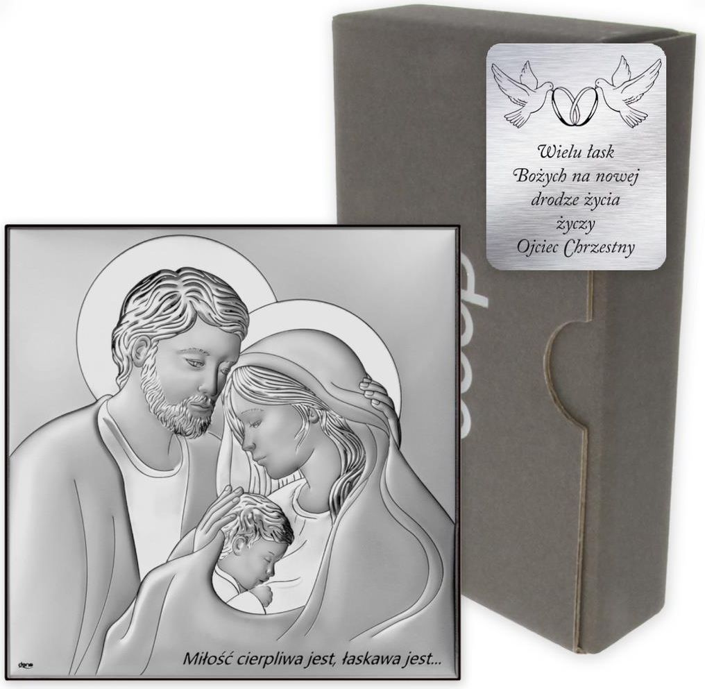 Obrazek srebrny Święta Rodzina. Postawiony lub zawieszony w pomieszczeniu ozdobi każde wnętrze. Z przodu obrazka został fabrycznie wygrawerowany napis: "Miłość cierpliwa jest, łaskawa jest...". Obrazek wyprodukowany został przez firmę Dono. Gwarantuje ona, iż przedmiot nabyty przez Państwa został wyprodukowany we Włoszech, zgodnie z kunsztem i tradycją obróbki metali szlachetnych. Obrazek wykonany jest z blachy aluminium pokrytej warstwą srebra. Całość zabezpieczona jest warstwą lakieru, która chroni przed czynnikami zewnętrznymi. Wpływa to na bezproblemowe użytkowanie bez potrzeby częstego czyszczenia. Obrazek z wizerunkiem Świętej Rodziny można zarówno powiesić, jak i postawić na dołączonej podstawce. Do czyszczenia zalecamy używanie wyłącznie czystych, miękkich ściereczek, a w przypadku zabrudzeń letniej wody. Nie należy stosować detergentów, alkoholu ani znajdujących się w sprzedaży środków i ściereczek do czyszczenia srebra, gdyż mogą one uszkodzić warstwę ochronną. Obrazek srebrny z wizerunkiem Świętej Rodziny to obraz zjednoczenia (komunii) Świętych Osób. Jednocześnie obraz ten wyraża zjednoczenie, miłość, życie małżeństwa i rodziny chrześcijańskiej, która dąży do świętości i do tworzenia komunii we własnym małżeństwie i rodzinie, dzięki czemu jest to doskonały prezent na ślub czy narodziny dziecka.