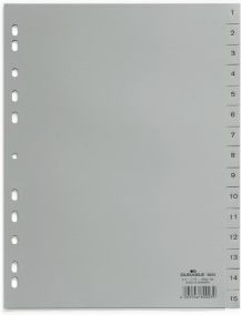 6524 Przekładki PP A4 szare nadrukowane indeksy 1-15 Durable najważniejsze cechy:Ilość przekładek: 15indeksy numeryczneformat: A4kolor: szarywymiary: 297 x 215 x 230 mmDLP 6524 Przekładki PP A4 szare nadrukowane indeksy 1-15 DurableZadbaj o porządek w swoim biurze. Odpowiednia przestrzeń może wpłynąć na efektywność Twojej pracy.Wszystko pod rękąTo doskonały sposób na uporządkowanie swoich dokumentów. Dzięki wygodnym przekładkom dużo łatwiej będziesz mógł znaleźć potrzebną kartkę w segregatorze. To 15 klasycznych szarych przekładek w formacie A4 z tłoczonymi indeksami 1 - 15. Dodatkowo przekładki posiadają wzmocnione brzegi otworów.Segregator uporządkowanyPrzekładki posiadają uniwersalne dziurkowanie. Wykonane zostały z polipropylenu, z tłoczonymi znacznikami. Każdy komplet jest osobno pakowany w folię. Szary kolor pozwala na stworzenie czytelnych i przejrzystych notatek. To doskonały produkt do biura, szkoły, domu i nie tylko.