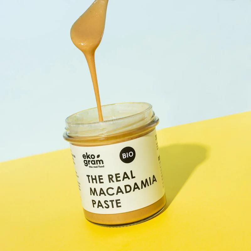 PASTA ORZECHOWA MASŁO ORZECHOWE Z ORZECHÓW MAKADAMIA EKO CERTYFIKAT Ekogram THE REAL MACADAMIA PASTE – BIO Pasta z Orzechów Makadamia 100% THE REAL MACADAMIA PASTE to w 100% naturalna pasta z orzechów makadamia o wyjątkowo kremowej konsystencji i delikatnie słodkim, wyrafinowanym smaku. Produkt powstaje wyłącznie z prażonych, ekologicznych orzechów makadamia, bez dodatku soli, cukru, oleju palmowego ani konserwantów. Naturalny smak i prosty, jeden składnik Pasta z orzechów makadamia Ekogram to produkt o krótkim, przejrzystym składzie: Składniki: 100% BIO orzechy makadamia prażone bez dodatku soli bez dodatku cukru bez oleju palmowego i innych tłuszczów bez konserwantów oraz sztucznych aromatów Taki skład sprawia, że BIO pasta z orzechów makadamia zachowuje naturalny smak orzechów i ich charakterystyczny, maślany profil. Dlaczego warto wybrać pastę makadamia Ekogram? BIO pasta z orzechów makadamia to produkt dla osób, które poszukują: żywności ekologicznej o prostym składzie kremowej, aksamitnej konsystencji masła orzechowego delikatnie słodkiego smaku bez dodatku cukru alternatywy dla klasycznych past orzechowych (fistaszkowej, migdałowej itp.) Prażone orzechy makadamia z certyfikatem BIO o naturalnie wysokiej zawartości tłuszczów roślinnych nadaje paście aksamitną strukturę, co ułatwia jej rozprowadzanie na pieczywie oraz łączenie z innymi składnikami. Jak smakuje pasta z orzechów makadamia? Masło z orzechów makadamia BIO charakteryzuje się: delikatną, naturalną słodyczą maślanym, subtelnie orzechowym posmakiem gładką, aksamitną konsystencją Profil smakowy sprawia, że pasta makadamia jest odpowiednia dla osób, które preferują łagodniejsze pasty orzechowe, o mniej wyrazistym i bardziej kremowym charakterze niż klasyczne masło orzechowe. Zastosowanie – wszechstronna pasta orzechowa w kuchni THE REAL MACADAMIA PASTE można wykorzystać w wielu typach dań – od prostych śniadań, po bardziej złożone desery. Sprawdza się m.in. jako: smarowidło do pieczywa (świeżego, pełnoziarnistego, żytniego) dodatek do owsianki, jaglanki lub musli składnik koktajli i smoothie element deserów, kremów, nadzień oraz ciast dodatek do batoników energetycznych i kulek mocy składnik sosów i dressingów o orzechowej nucie Kremowa struktura pasty ułatwia jej łączenie z innymi produktami, zarówno w daniach słodkich, jak i w kompozycjach bardziej wytrawnych. Wartość odżywcza – skoncentrowane źródło energii BIO pasta makadamia dostarcza energii oraz tłuszczów pochodzenia roślinnego, a także białka i niewielkiej ilości węglowodanów. Może stanowić uzupełnienie zbilansowanej diety, szczególnie w posiłkach wymagających większej kaloryczności. Wartość odżywcza w 100 g produktu Wartość energetyczna 3021 kJ / 734 kcal Tłuszcz 73,1 g w tym kwasy tłuszczowe nasycone: 12,5 g Węglowodany 5,1 g w tym cukry: 4,8 g Białko: 8,5 g Sól: 0 g Ekologiczne pochodzenie i certyfikacja THE REAL MACADAMIA PASTE powstaje z orzechów pochodzących z upraw ekologicznych i jest objęta certyfikatem PL-EKO-03, potwierdzającym zgodność z wymaganiami rolnictwa ekologicznego. Surowiec pozyskiwany jest z upraw ekologicznych z Kenii. Certyfikowane pochodzenie surowców sprzyja zachowaniu stałej jakości produktu oraz dbałości o środowisko naturalne. Szklane opakowanie – funkcjonalne i przyjazne środowisku Pasta z orzechów makadamia dostępna jest w szklanym słoiku 300 g, który: chroni produkt przed czynnikami zewnętrznymi jest wygodny w użyciu – ułatwia porcjowanie i przechowywanie nadaje się do wielokrotnego wykorzystania w gospodarstwie domowym może zostać poddany recyklingowi Szczegółowe informacje o produkcie BIO Pasta z Orzechów Makadamia 100% Składniki: 100% BIO orzechy makadamia prażone Kraj pochodzenia surowca: Kenia Zawartość netto: 300 g Certyfikaty: produkt pochodzący z upraw ekologicznych, objęty certyfikatem PL-EKO-03 Dystrybutor: Nutkraft sp. z o.o. Termin przydatności: produkt z regularnych dostaw. Alergeny Produkt zawiera orzechy makadamia. Może również zawierać orzeszki ziemne, inne orzechy, nasiona sezamu. Informacja ta jest istotna dla osób z alergiami pokarmowymi lub nadwrażliwością na orzechy i sezam. Kontrola jakości i badania Ekogram BIO pasta z orzechów makadamia poddawana jest regularnym badaniom laboratoryjnym. Produkt został przebadany m.in. na zawartość: aflatoksyny B₁, B₂, G₁, G₂ metali ciężkich ochratoksyny A salmonelli drożdży i pleśni Zakres badań pozwala utrzymywać wysokie standardy bezpieczeństwa oraz powtarzalną jakość każdej partii produktu. BIO pasta z orzechów makadamia 100% THE REAL MACADAMIA PASTE to organiczne masło z orzechów makadamia o prostym, jednoskładnikowym składzie, aksamitnej konsystencji i delikatnie słodkim smaku. Ekologiczne pochodzenie, certyfikacja BIO, szklane opakowanie oraz możliwość szerokiego zastosowania w kuchni sprawiają, że produkt dobrze wpisuje się w założenia świadomej, zrównoważonej diety. Ekogram - Niezależny producent żywności organicznej