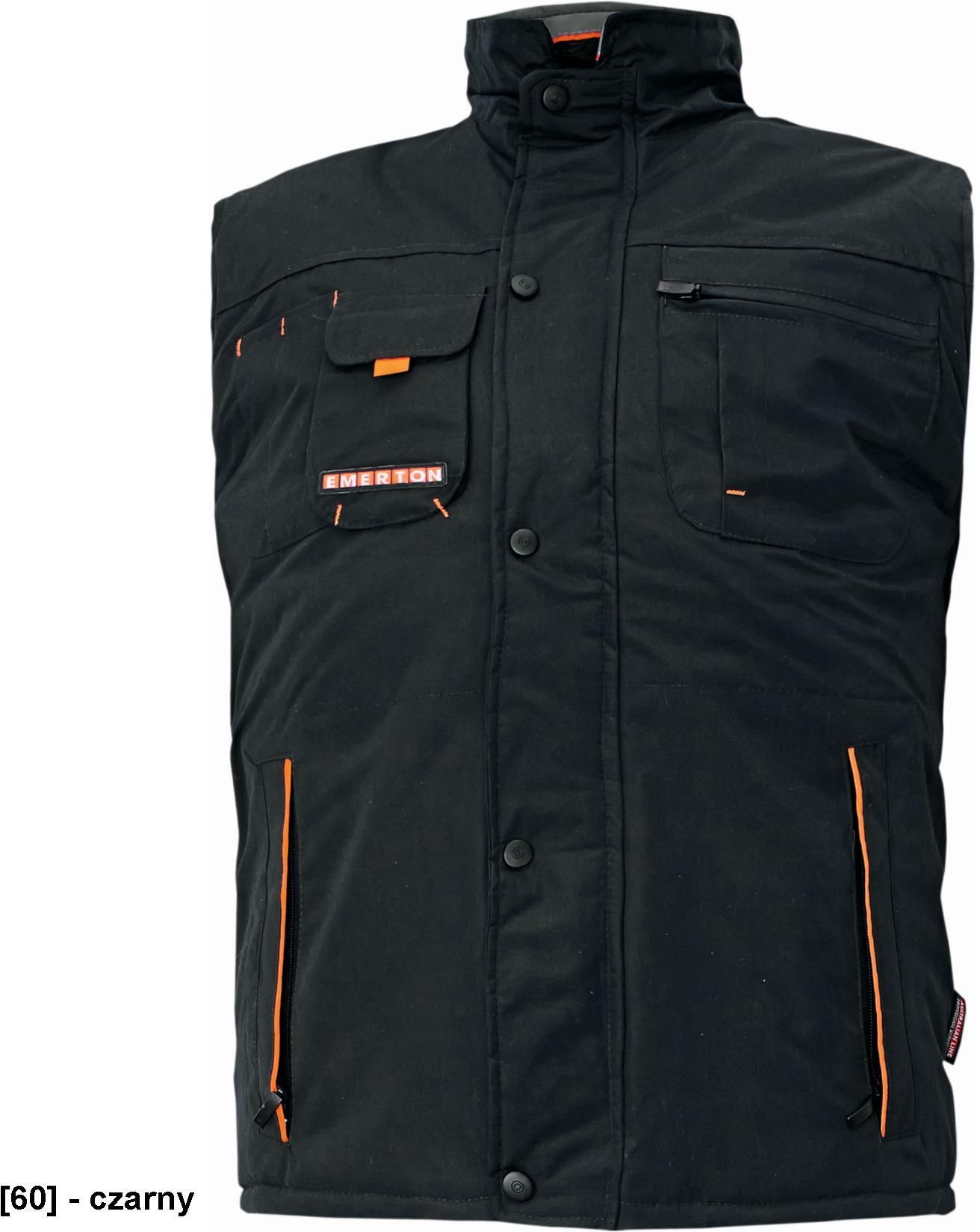 Kamizelka zimowa Emerton VestaWodoodporna kamizelka (dostosowana maszynowego haftu), podszewka, wiele kieszeni, kieszonka na komórkę, kryty suwak, sznurek ściągający w pasie.Materiał: - 100% poliester, - mikro włókno PVC, - 220 g/m2.Kolor: czarny.Rozmiary: S-3XL.
