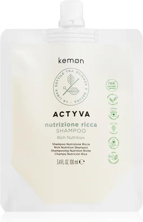 KEMON ACTYVA NUTRIZIONE RICCA SHAMPOO - Szampon intensywnie nawilżający do suchej skóry głowy i bardzo suchych włosów. Szampon intensywnie nawilżający do suchej skóry głowy i bardzo suchych włosów. Delikatnie oczyszcza włosy, nie naruszając naturalnej równowagi skóry głowy. Odżywia włosy, czyniąc je łatwymi do rozczesania, miękkimi i lśniącymi. Kluczowe składniki: Tłuszcze zawarte w oliwie z oliwek, proteiny owsa. Sposób użycia: Nakładać na włosy etapami. W celu rozprowadzenia preparatu przeczesać włosy, kierując się od linii włosów ku górze głowy. Masować, wykonując palcami ruchy okrężne. Doprowadzić do powstania piany, spłukać i osuszyć ręcznikiem. Powtórzyć w razie potrzeby.