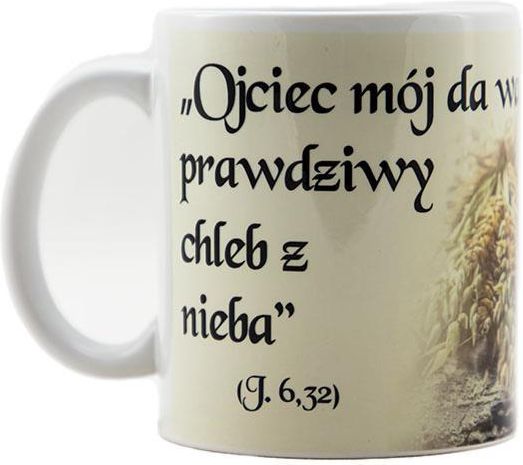 Kubek w kolorze białym z kolorowym nadrukiem i napisem: Ojciec mój da wam prawdziwy chleb z nieba. J 6,23 Kubek nadaje się do mycia w zmywarkach. Materiał: ceramika Wysokość: 95 mm Średnica górna/dolna: 80/80 mm