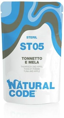 Marka *Natural Code* została stworzona w 2010 r. we Włoszech, a jej pomysłodawca chciał by jedzenie dla zwierząt składało się wyłącznie z produktów naturalnych i spełniających wszystkie ich wymagania żywieniowe. Dlatego w formułach Natural Code znajdziesz mięso z gospodarstw wolno wybiegowych, ryby poławiane w oceanach, a także warzywa najwyższej jakości. Połączenie wiedzy oraz doskonałych składników sprawia, że karma pod kątem, zapachu, koloru i konsystencji zachwyca zarówno kota, jak i jego właściciela. Składniki są gotowane na parze i konserwowane wodą, w której się gotują. Dopracowany proces przygotowania, począwszy od wyboru składników po pakowanie, sprawia, że efekt końcowy zaspokoi potrzeby najbardziej wymagającego konsumenta. Każda z formuł została stworzona we współpracy z Wydziałem Nauk Weterynaryjnych w Turynie i pracował nad nią sztab specjalistów żywienia kotów. Karmy zostały oznaczone unikatowym krótkim symbolem ułatwiającym zapamiętanie ulubionego smaku naszego pupila. Mokra karma Natural Code 70g to posiłek dla kota o dużej zawartości mięsa. *Natural Code Steril* to karma uzupełniająca o obniżonej kaloryczności przeznaczona dla kotów sterylizowanych. Połączenie smakowitego tuńczyka bogatego w białko i jabłka o wielu właściwościach odżywczych dostarczającego błonnik ułatwiający pasaż jelitowy oraz polifenole i witaminy. Skład: 44,29% tuńczyk, 4,,29% jabłko, 1,43% brązowy ryż. Woda: 49,99%. Analiza: wilgotność 84,86%, białko surowe 12,39%, tłuszcz surowy 0,34%, popiół surowy 0,96%, włókno surowe 0,15%. Energia: (kcal/100g) 50,82.