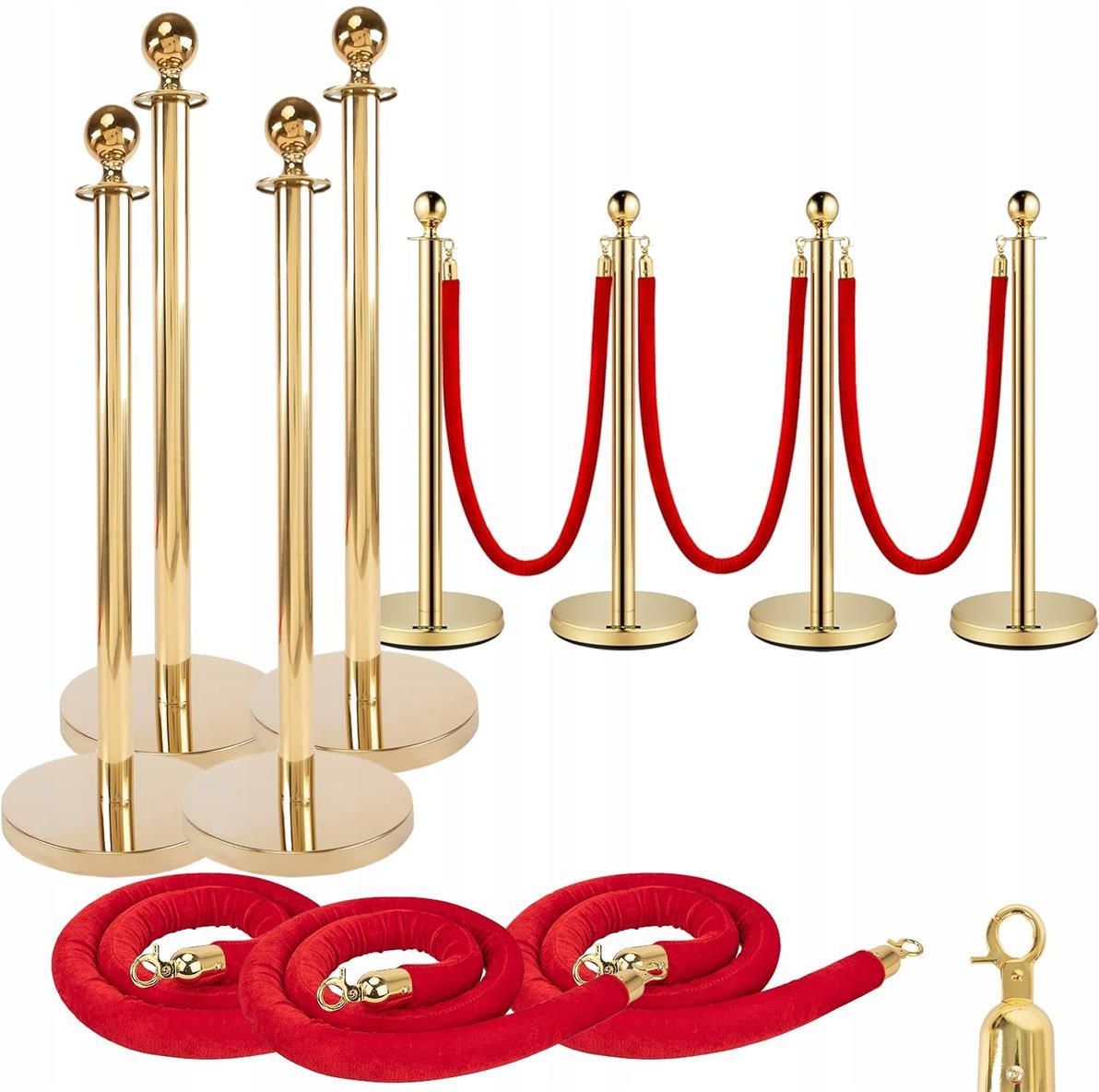 4 ZŁOTE SŁUPKI ODGRADZAJĄCE + 3 CZERWONE LINY BARIERKA KOLEJKOWA HOTELOWA Fotobudka ZESTAW Zestaw słupków odgradzających to kwintesencja elegancji i funkcjonalności, który jest idealny dla miejsc wymagających pełnego stylu odgrodzenia przestrzeni. Cztery, solidne, złote słupki wykonane ze stali …