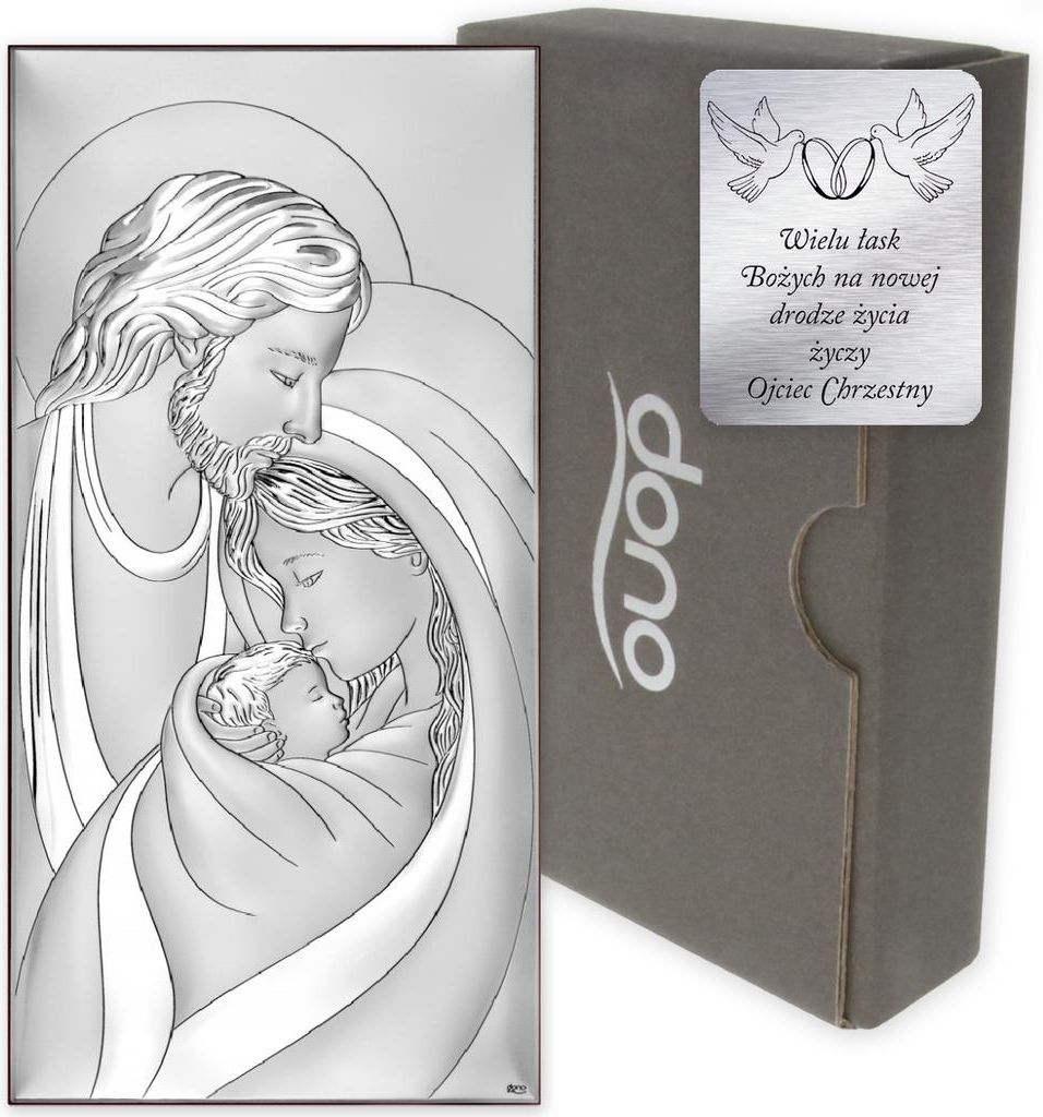 Obrazek srebrny Święta Rodzina. Postawiony lub zawieszony w pomieszczeniu ozdobi każde wnętrze. Obrazek wyprodukowany został przez firmę Dono. Gwarantuje ona, iż przedmiot nabyty przez Państwa został wyprodukowany we Włoszech, zgodnie z kunsztem i tradycją obróbki metali szlachetnych. Obrazek wykonany jest z blachy aluminium pokrytej warstwą srebra. Całość zabezpieczona jest warstwą lakieru, która chroni przed czynnikami zewnętrznymi. Wpływa to na bezproblemowe użytkowanie bez potrzeby częstego czyszczenia. Obrazek z wizerunkiem Świętej Rodziny można zarówno powiesić, jak i postawić na dołączonej podstawce. Do czyszczenia zalecamy używanie wyłącznie czystych, miękkich ściereczek, a w przypadku zabrudzeń letniej wody. Nie należy stosować detergentów, alkoholu ani znajdujących się w sprzedaży środków i ściereczek do czyszczenia srebra, gdyż mogą one uszkodzić warstwę ochronną. Obrazek srebrny z wizerunkiem Świętej Rodziny to obraz zjednoczenia (komunii) Świętych Osób. Jednocześnie obraz ten wyraża zjednoczenie, miłość, życie małżeństwa i rodziny chrześcijańskiej, która dąży do świętości i do tworzenia komunii we własnym małżeństwie i rodzinie, dzięki czemu jest to doskonały prezent na ślub czy narodziny dziecka.